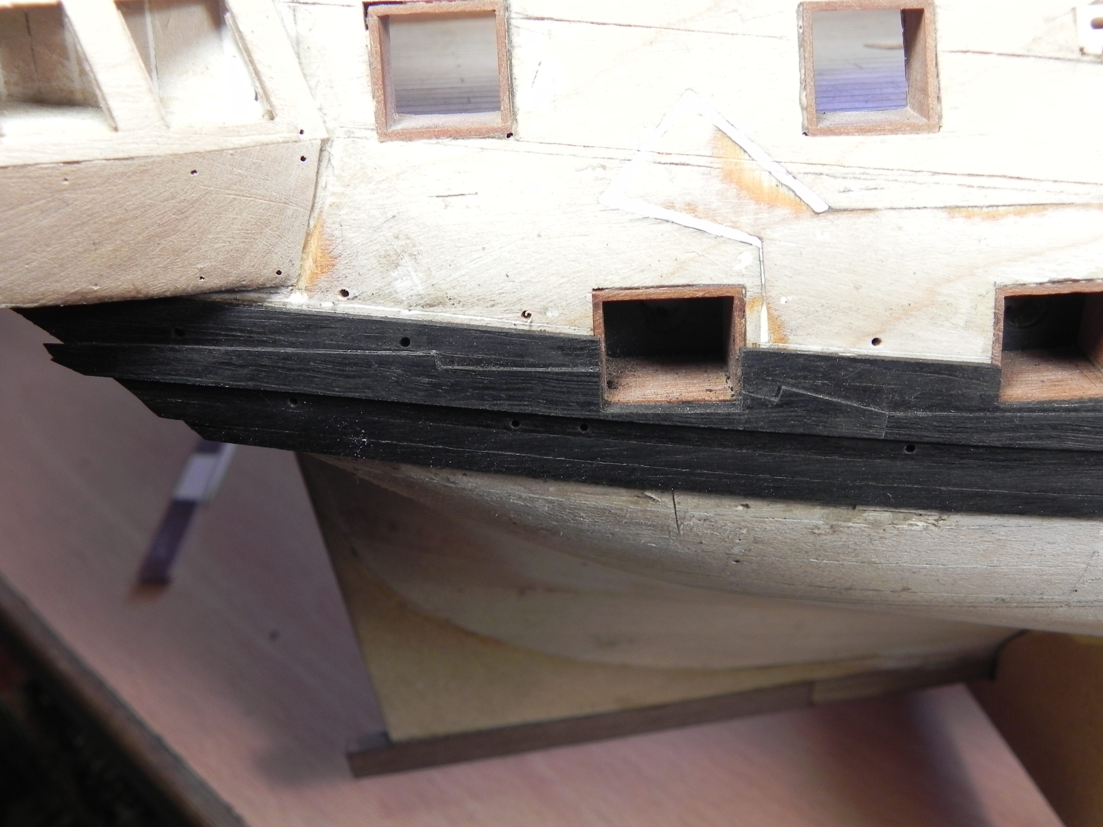 Додрый день, Игорь,хотел посоветоваться . Может быть в кормовой части, где штуки бархоута меняют форму и идут ( после пушечного порта) просто в 4 доски, не делать этого, а продолжать до конца калиброванными штуками. Вообщем, как мы сделали в носовой части. Как вы думаете. Это сопряжения довольно сложно исполнить.