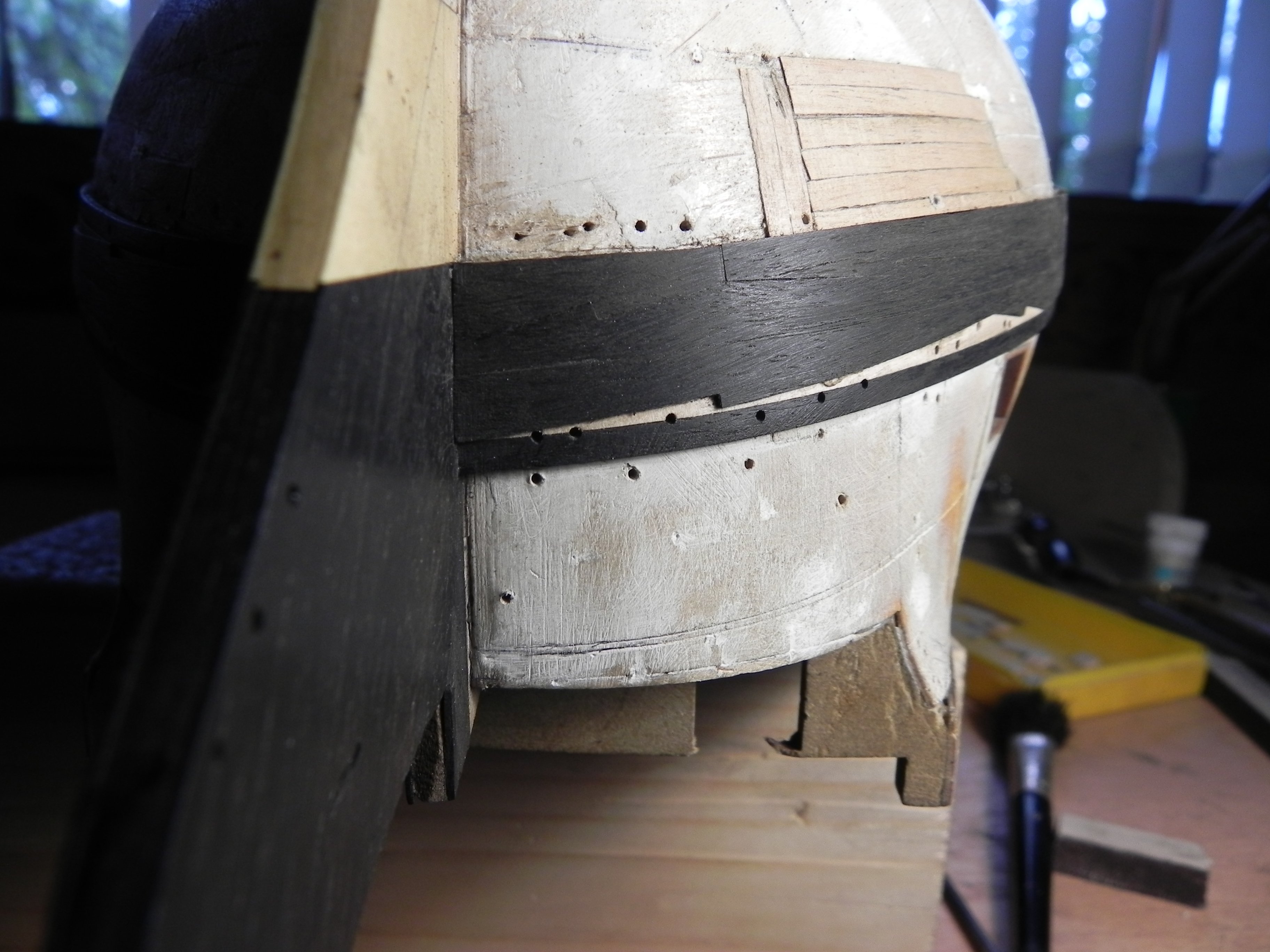 Самая возня в корме - это загнуть первую планку под бархоут, до транцевого реельса. Как только вы эту планку туда загнёте, больше никаких проблем с кормовой обшивкой у вас не будет. Собственно, между бархоутом, реельсом и рейкой при неудачном "загнутии"может получиться маленький треугольничек пустоты. На Виктори так и получилось - не смогли, видимо, "догнуть". Однако, этот треугольник заполнен. Всё, это единственная заморочка в корме.