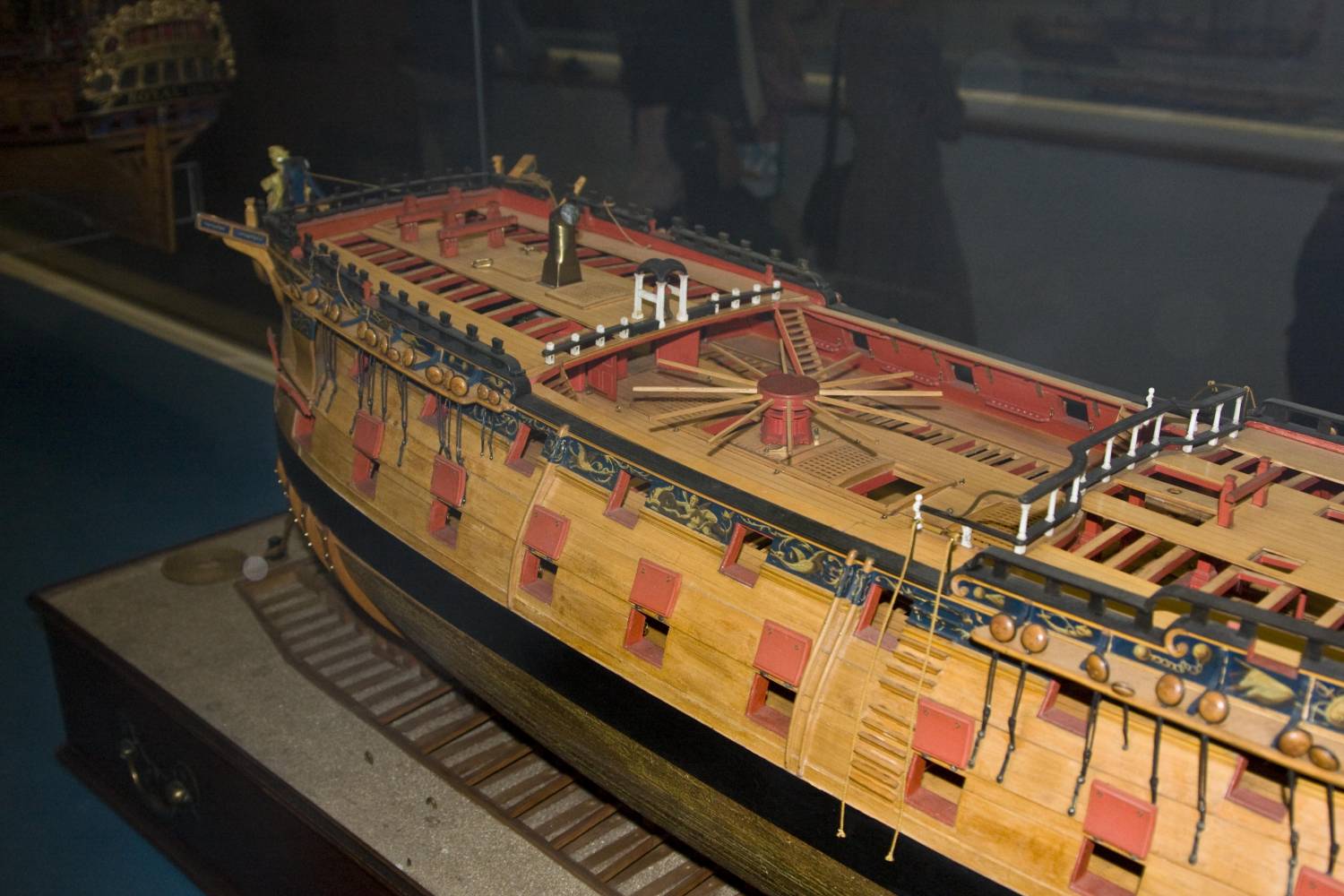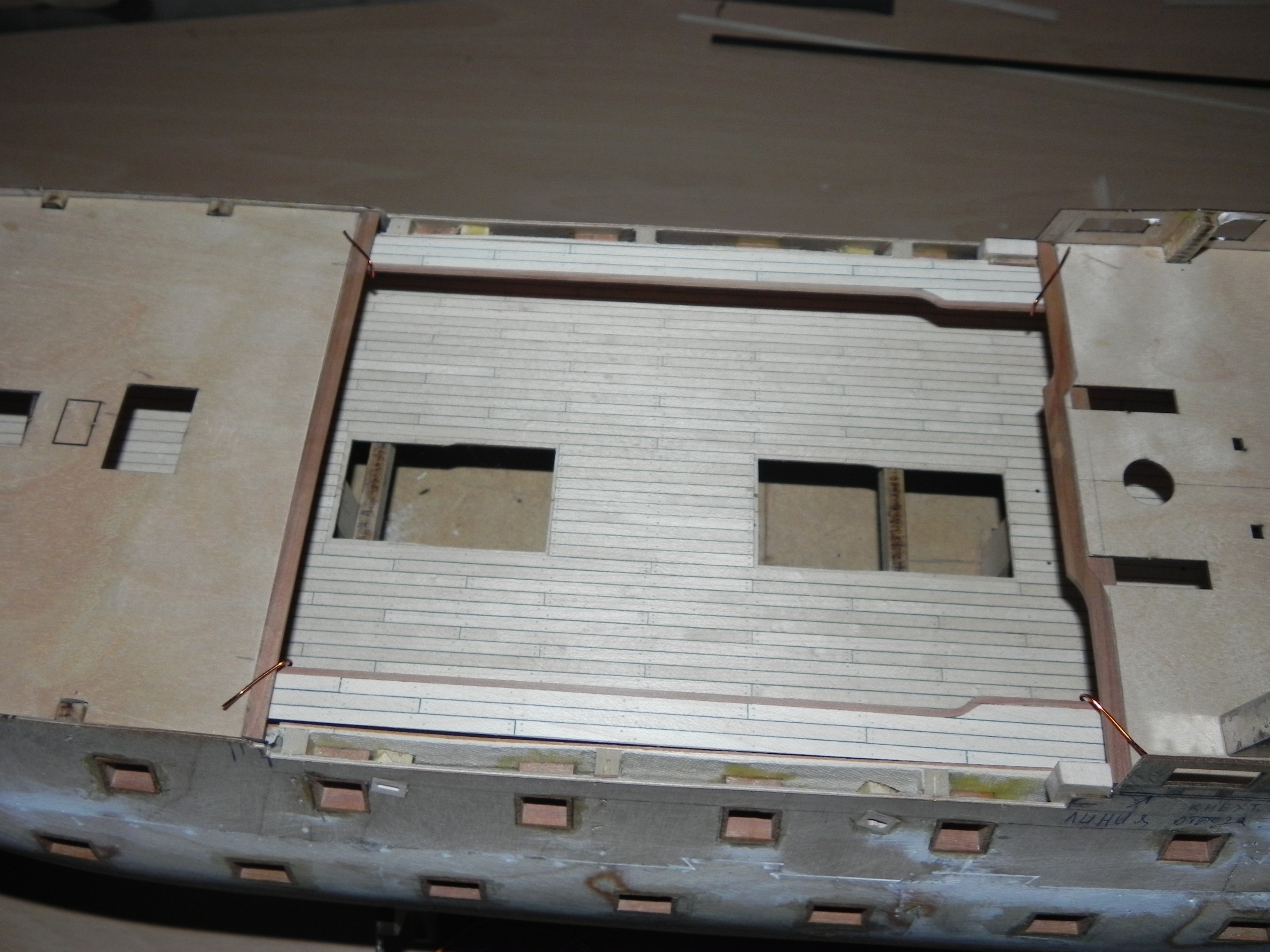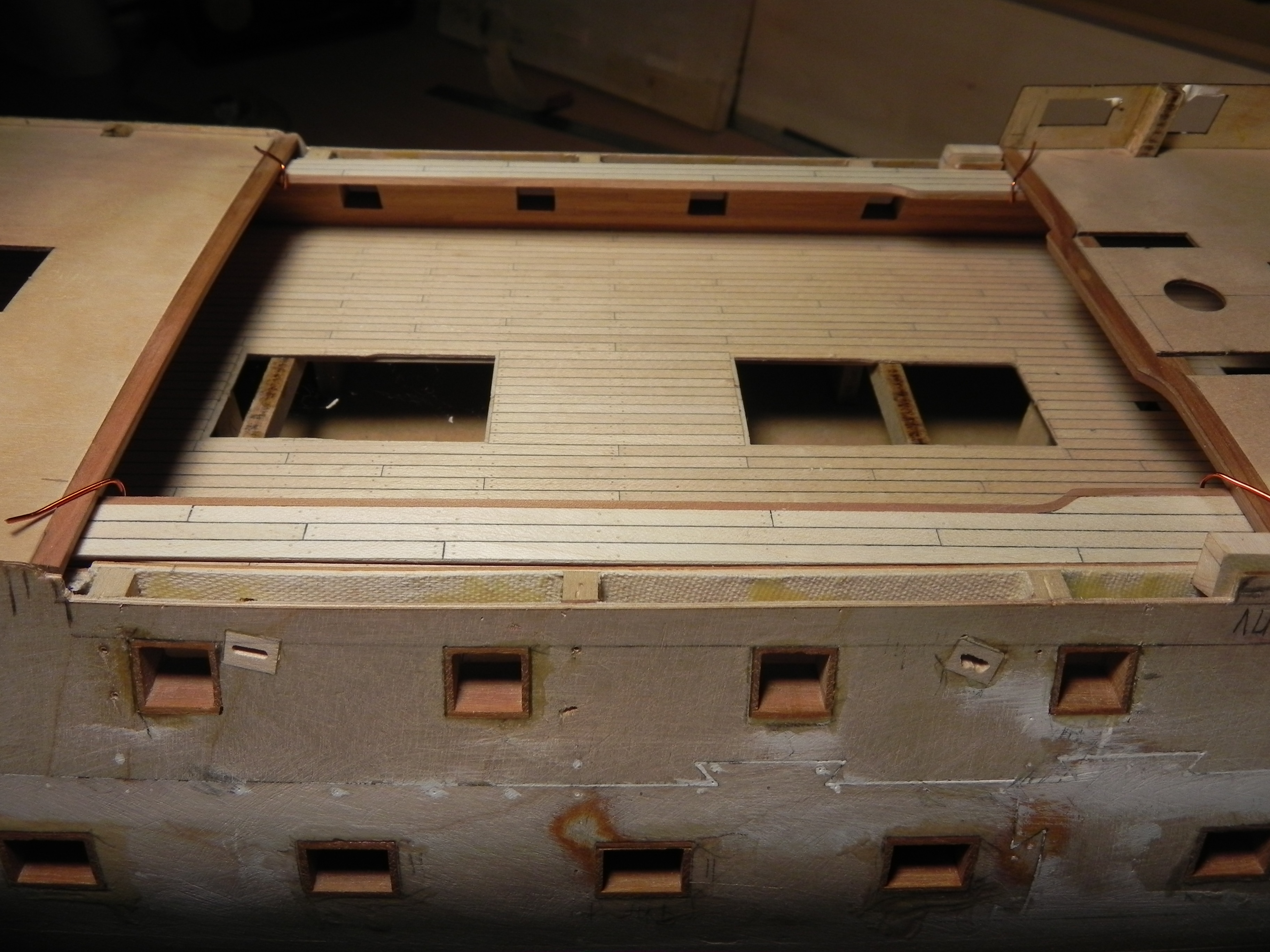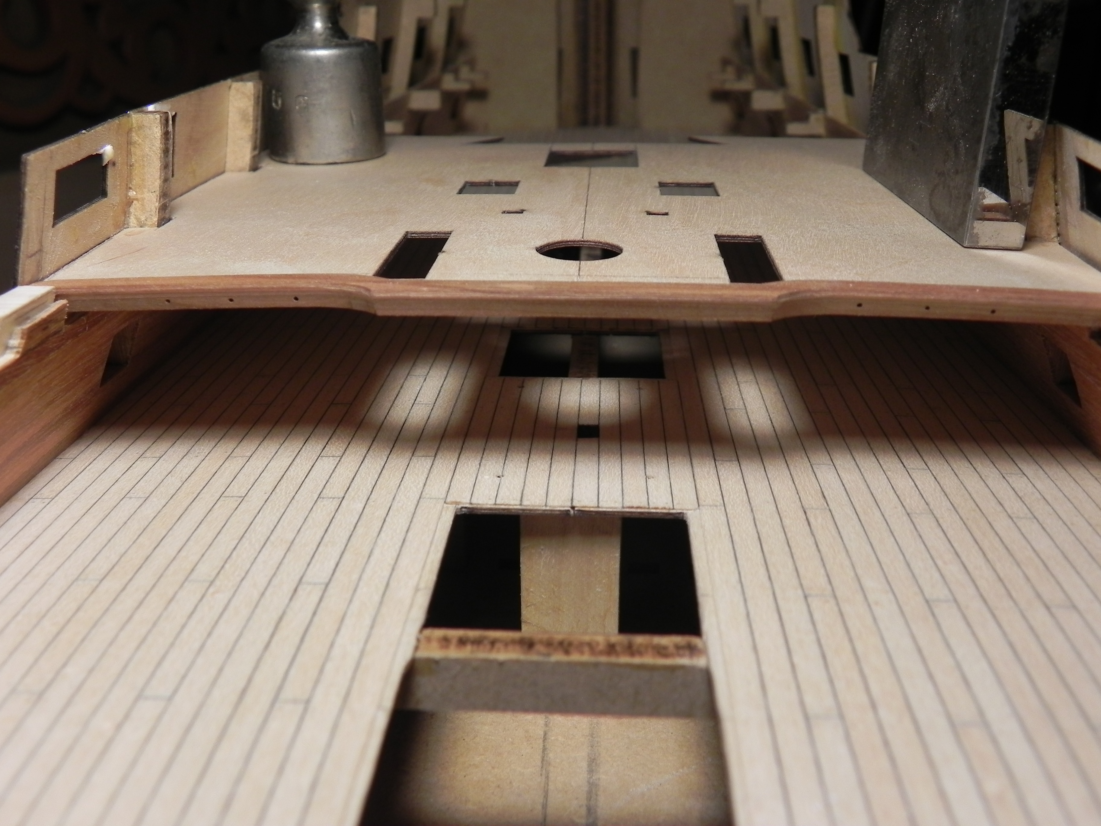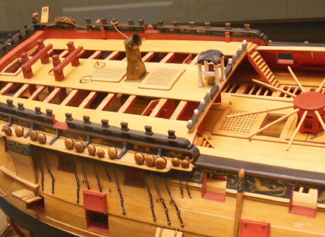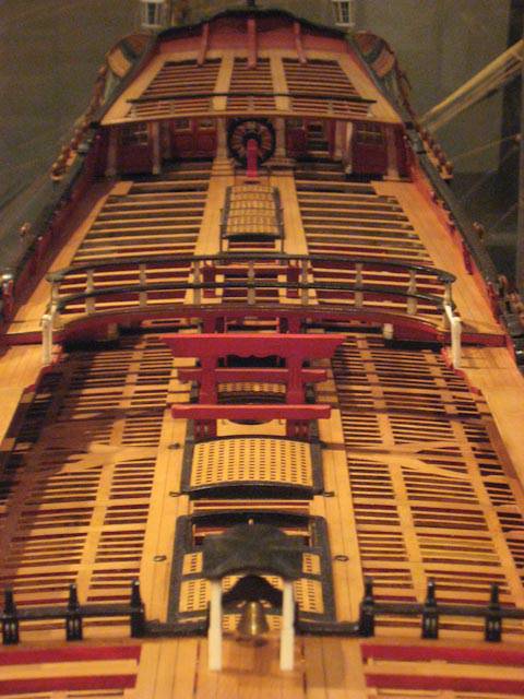 На этой модели видно, что англичане не заморачивались с утолщением бимса, а так же с зазорами между мостиком и квартердеком