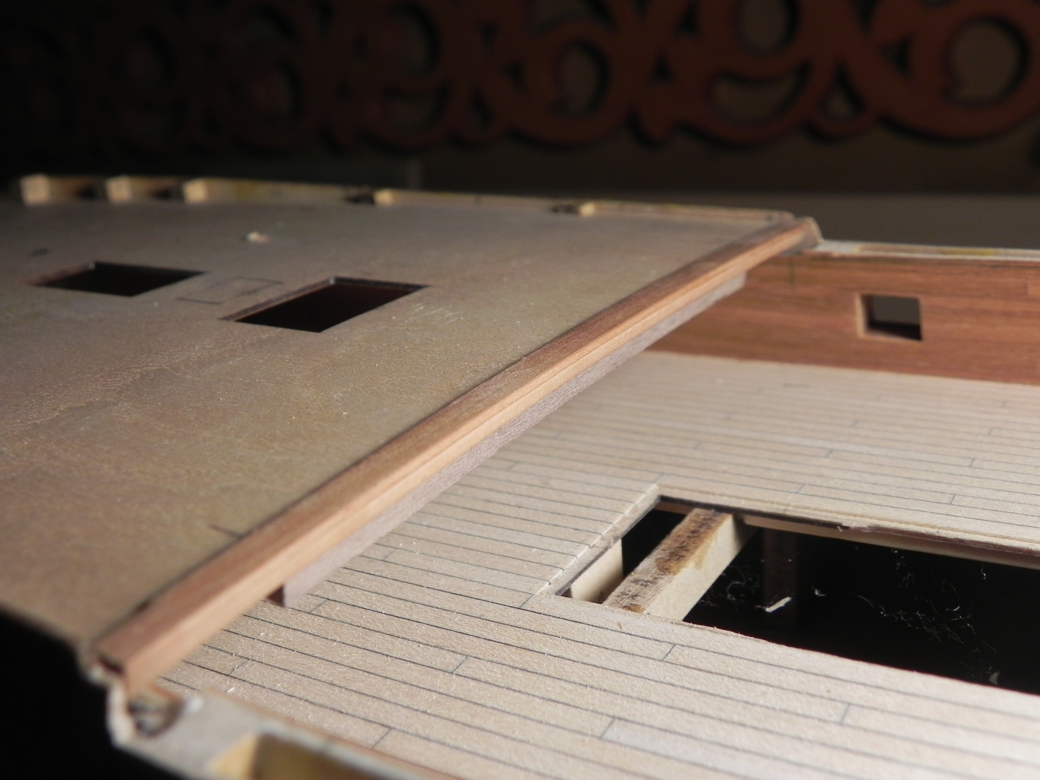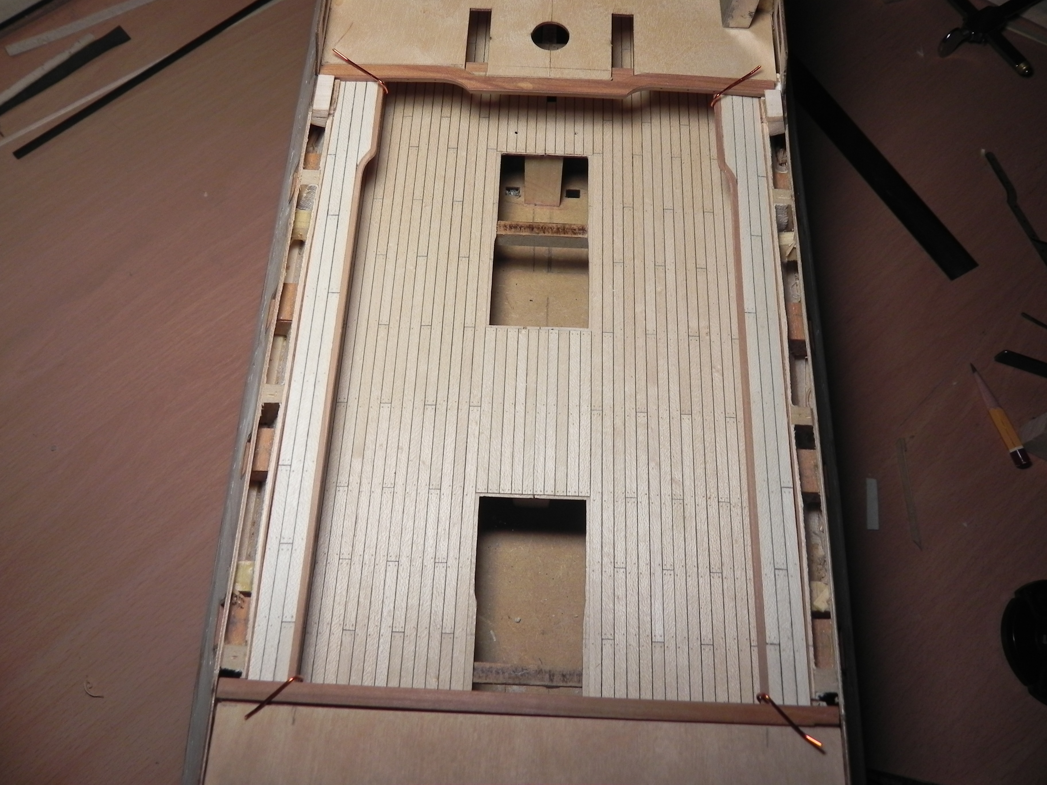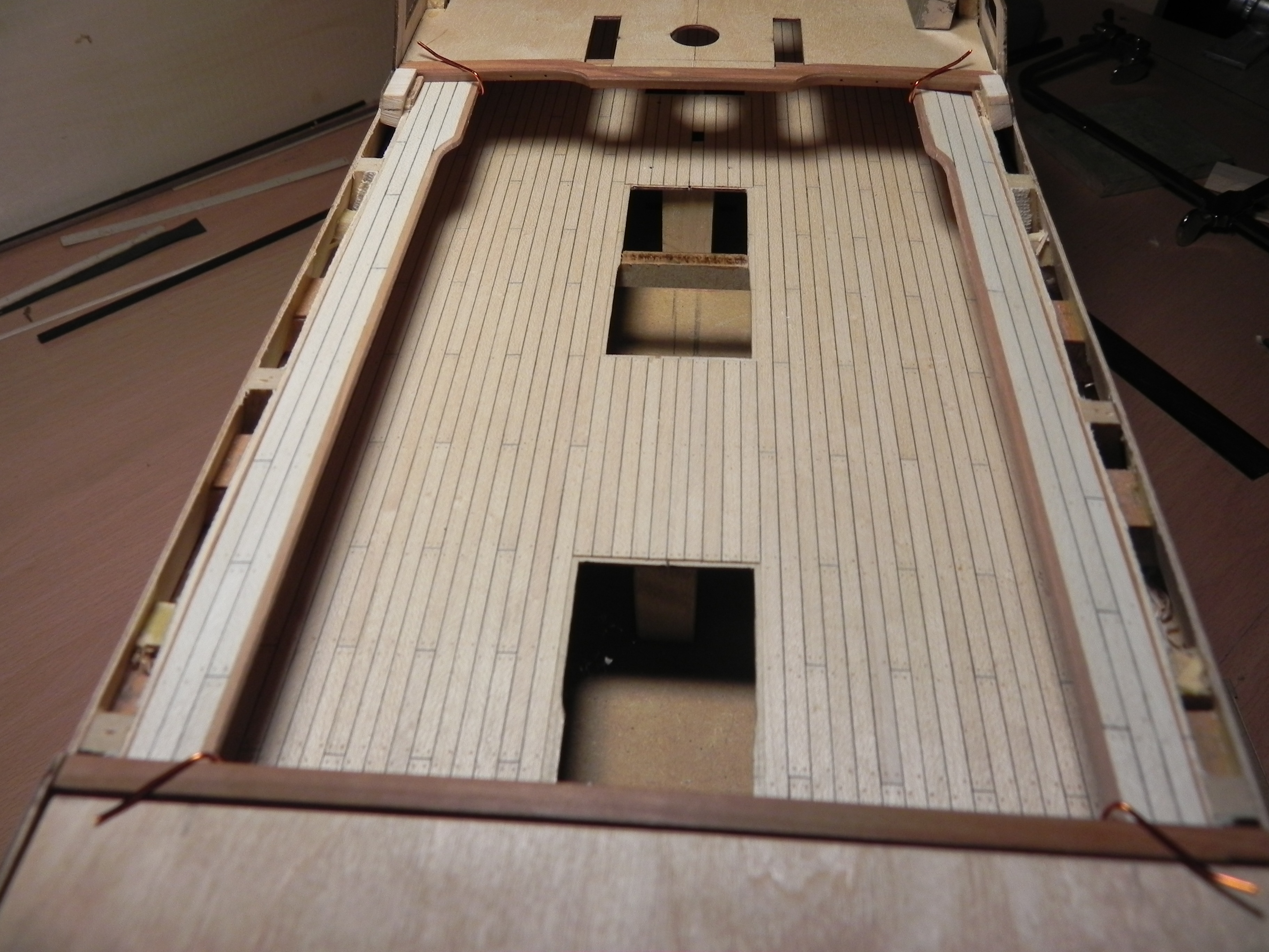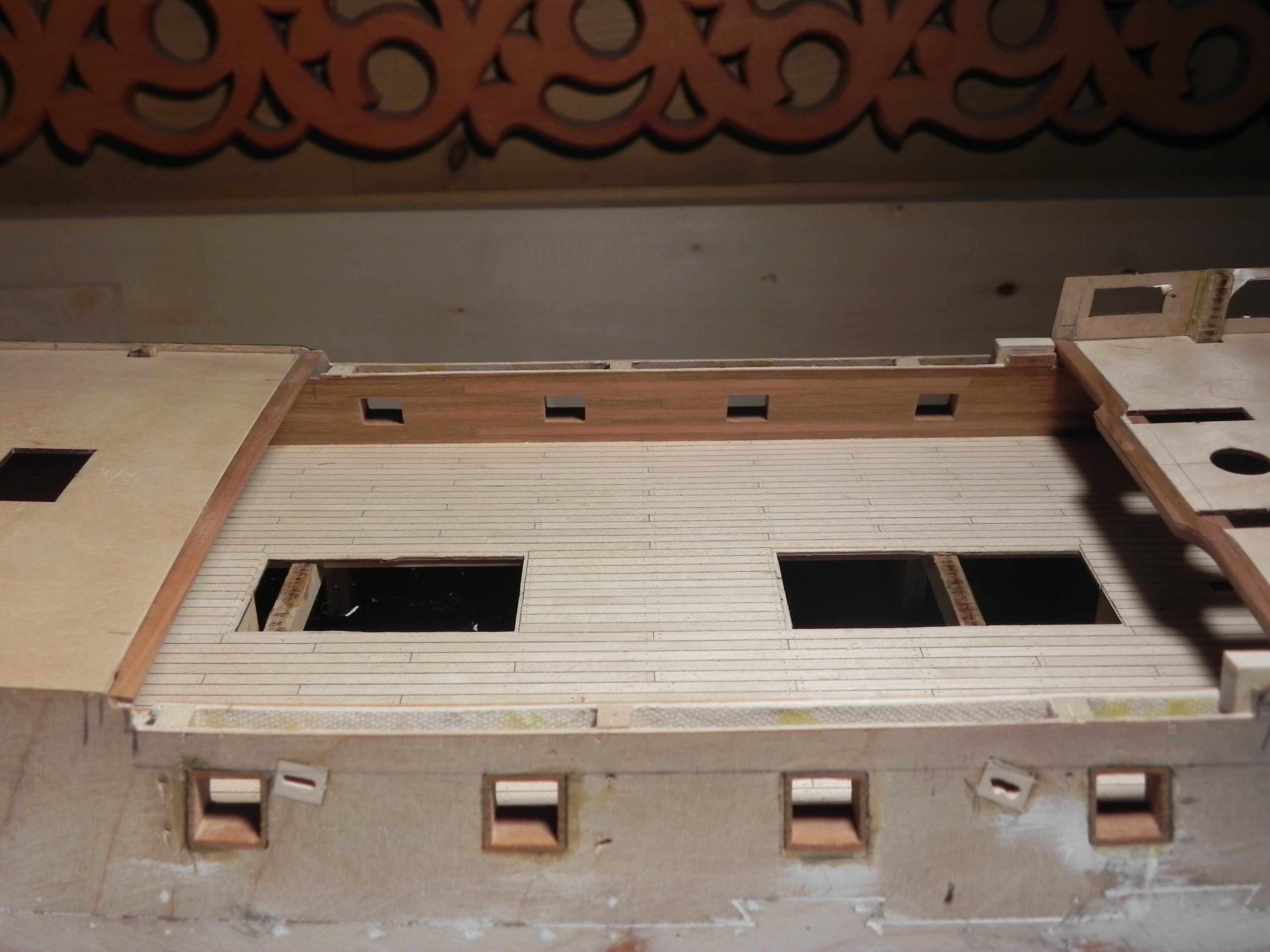 Всем добрый вечер. Что успел сделать за это время, показываю. Сделал новые бимсы, вырезал на торцевой их части рельеф. Долго экспериментировал и самый простой рельеф оказался лучше сложных. Заузил их как на фото Игоря, даже один из них из разного дерева,когда полерну и покрою чем нибудь будет видно хорошо. Сделал мостки,выбирал форму, нехотел прямые, ну судите сами. Придется чуть поднимать борт, пилил под бимсы из комплекта, а они толще, надо снова наращивать. Кто это проходил, прошу делать замечания, пока еще ничего не закреплял , можно переделать .