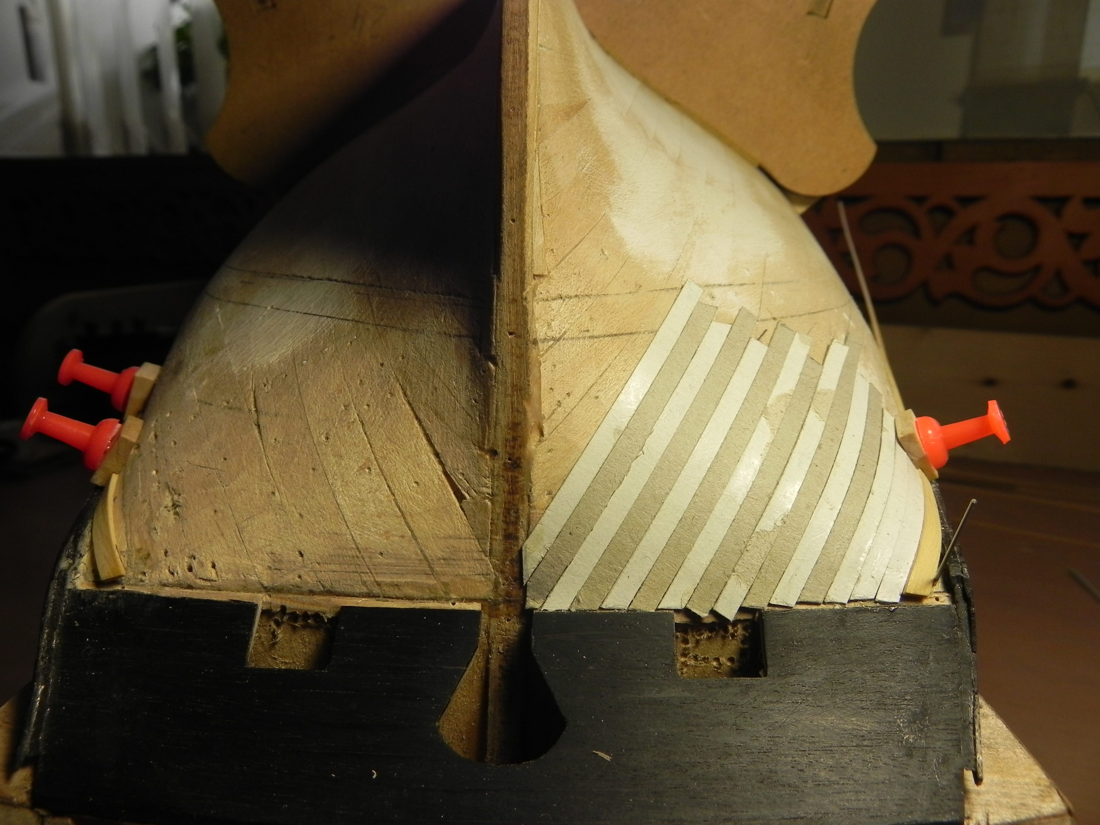 Вклинюсь. Моя ошибка в том, что первую рейку перегнул , после распарки вроде легко пошла, ну я и постарался. Внимательно фото просмотрел, там рейки ,по моему, просто ложатся без загиба в ту или другую сторону. И , по моему рейки ровные, без заужения. И угол большой роли не играет. У одного корабля чуть больше, у другого чуть меньше.Самое главное, чтобы бугра не было, а он пошел от первой рейки. Петр,насчет разметки я думал, если бы я все днище самшитом обшивал, тогда конечно, там бы рейки к корме шли зауженными, а я пока не имею опыта делать такие вещи,вот и стараешься попроще,ну ошибки делаешь. Уж точно, весь лоб в шишках.