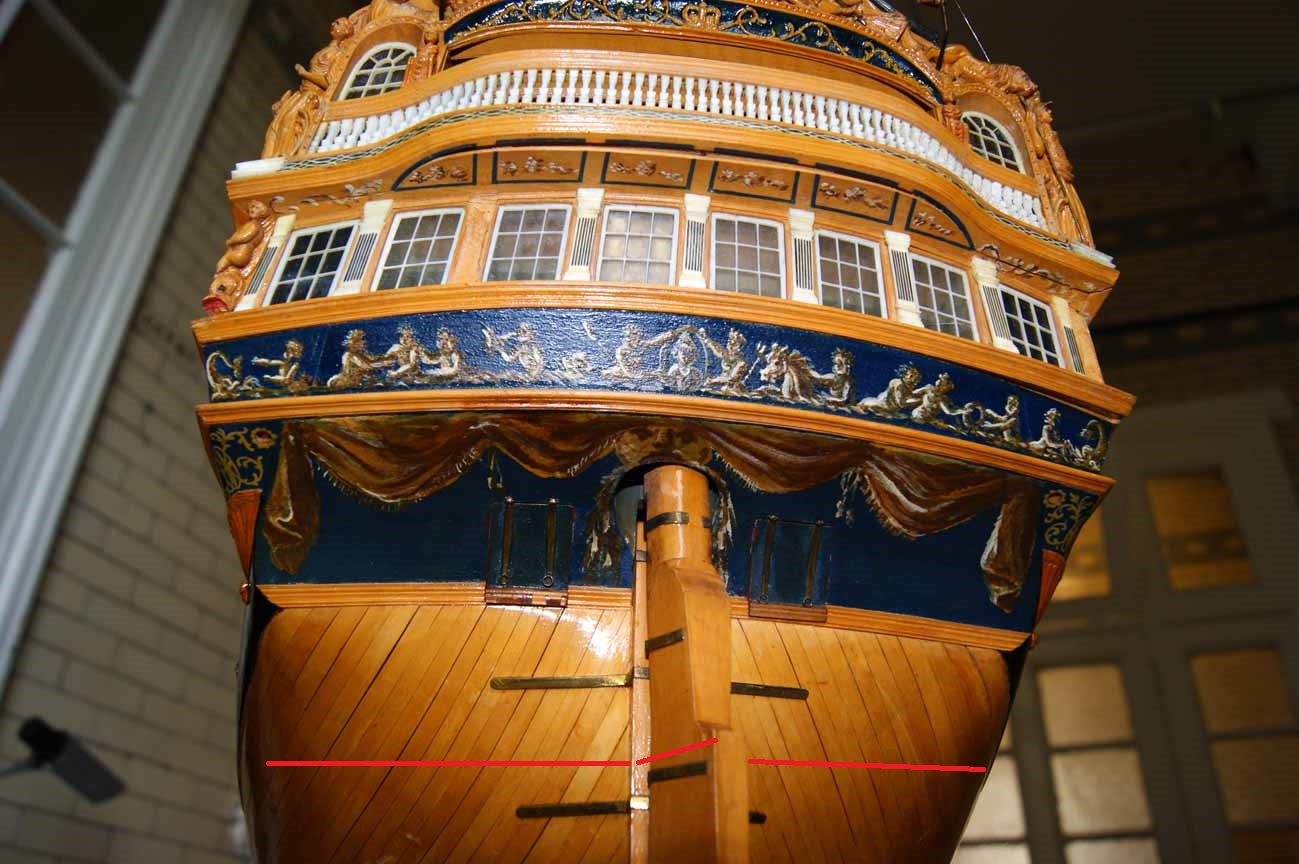 Ну, я говорил уже про маленькую вставочку под бархоут - она компенсировала бы то, что на настоящем корабле первая планка хитровыдуманная по форме. И вставочка эта - "клинышек" я советовал делать в конце. Ну, у меня так было. Мы забываем еще один момент: эта часть транцев на данной конкретной модели отдана моделисту на полную свободу растерзания: обрабатывай напильником, как хочешь. У Михаила обработано так, что первая планка легла практически без изгиба, это видно, и Миша подтверждает. А вот у меня пришлось гнуть в этом месте с большими нервами и матерными словами первую рейку. Дальше всё пошло без проблем. Миша, никаких потеряев не предвидится, а то, что Павел показал, что чистовые рейки идут не параллельно черновым - так это же хорошо, даже точнее, чем было бы, клей ты по линиям черновых реек. Смотрите на фотографии адмиралтеек, тут же их целая куча в этом ракурсе, у Миши рейки идут точно так же. И ещё, заметьте, у разных моделей разные углы встречи реек с реельсом или со штевнем. И потеряев нет.