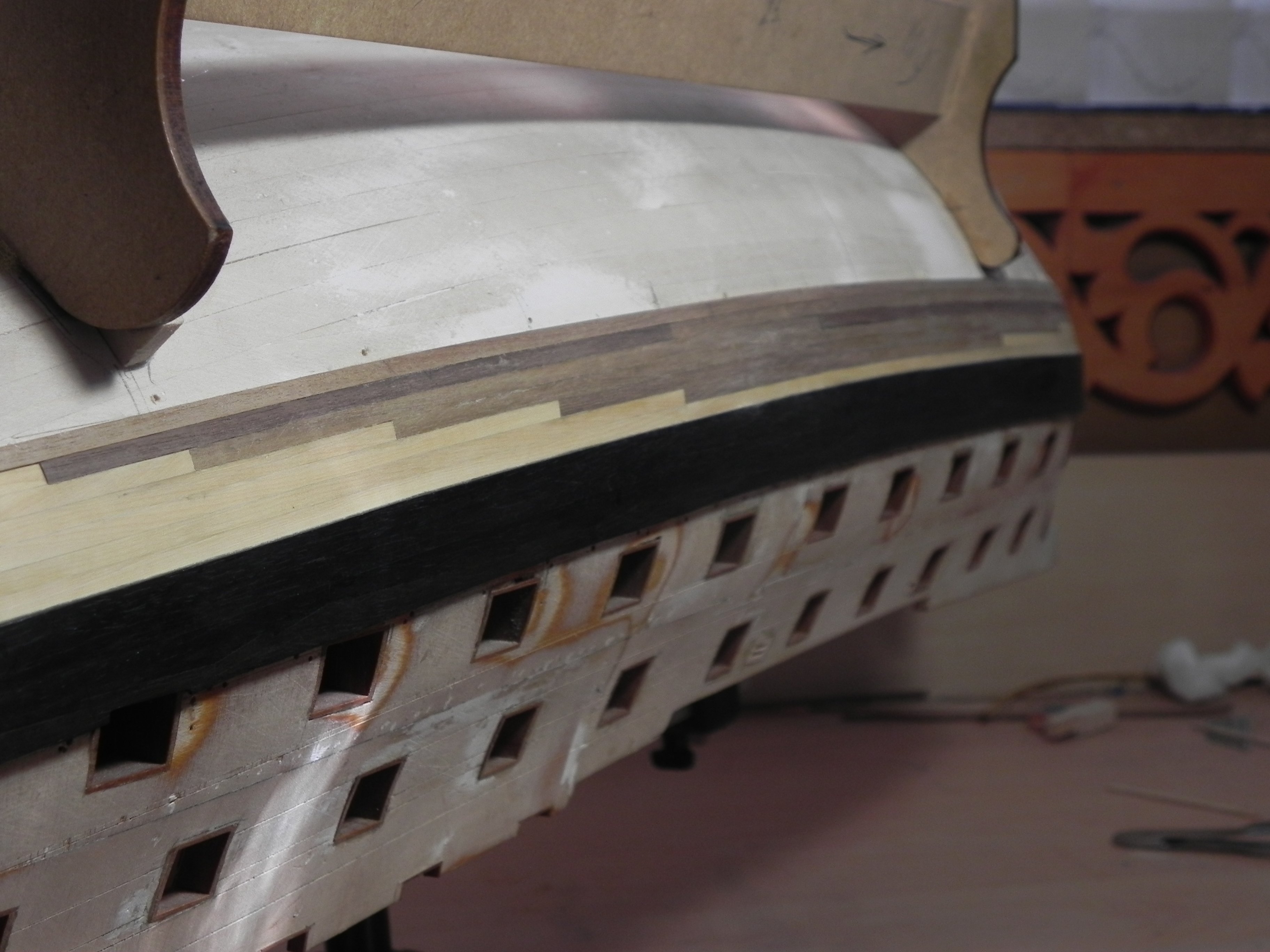 Обычно, его из самшита и делают. Вы скажете, что ниже обшивка тоже самшитовая. Но, так оно и было: и реельс, и обшивка на бортах на кораблях были покрашены минеральной охрой. До введения Регламентов начала 18 века, реельсы и скульптуры , а так же росписи покрывались позолотой, но бюджет к началу Семилетней войны оскудел настолько, что "золото" исчезло с кораблей окончательно.