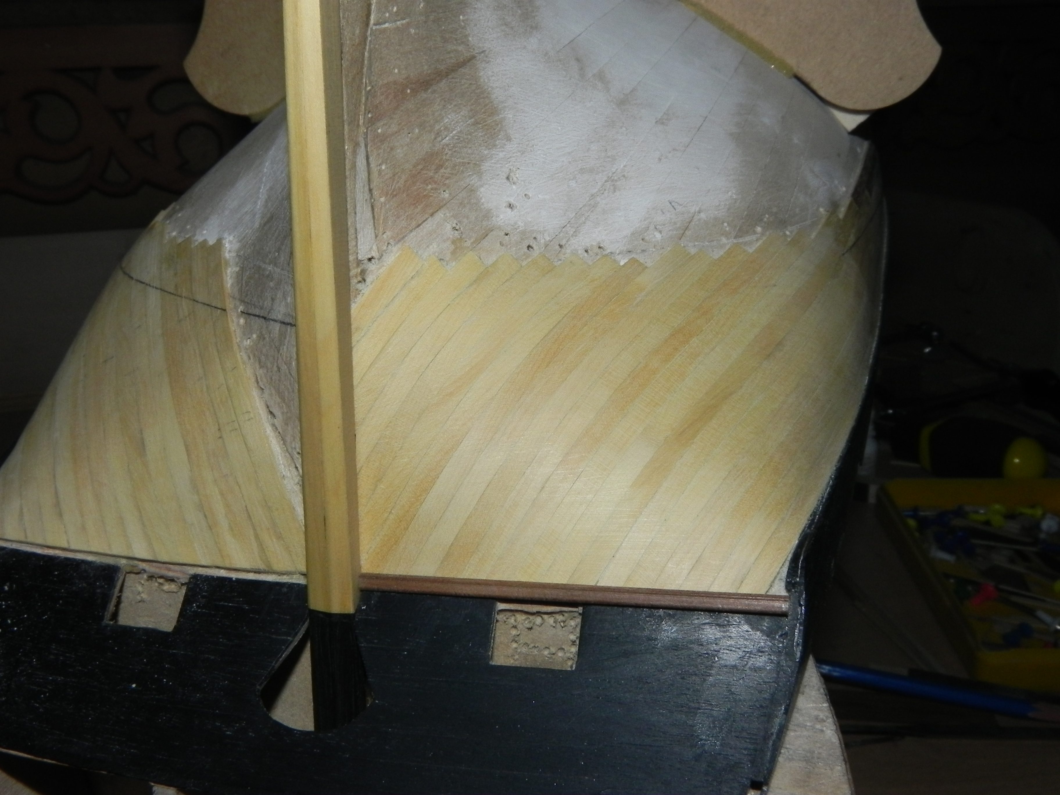 Миша, не то слово. Обжать медными пластинами из набора в их "готовом виде" - это просто нереально! Есть, конечно, один занудный способ: можно попробовать "отбить" листы на специально для этого сделанной оправке по форме петли. Но листы искажаются в размерах, поэтому мы волей-неволей приходим к единственно правильному решению, как и было на настоящих кораблях - пластины индивидуального размера и покроя (вплоть до вариантов "заплаток", как на Виктори)