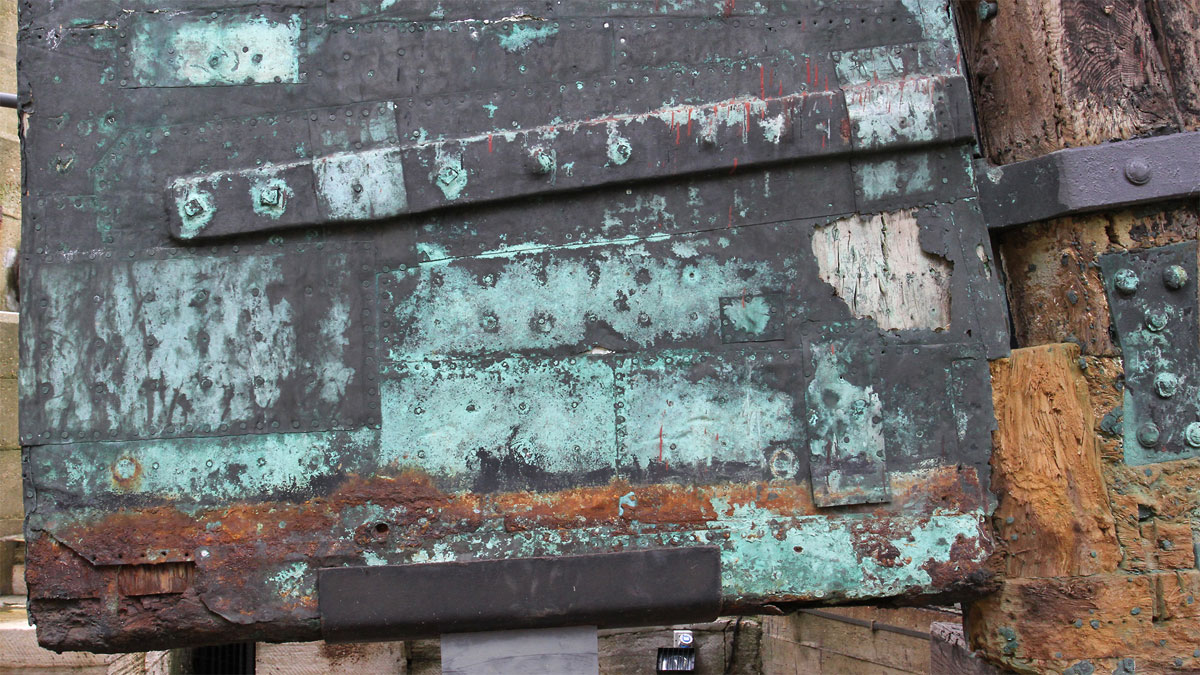 Миша, вы ведь помните, что петли руля ниже ватерлинии находятся под медной обшивкой, а не снаружи её? А это значит, что петли ниже ватерлинии можно упростить. Например, не высверливать их под каждый болт, а лишь сымитировать болты выдавливанием на резиновом коврике...