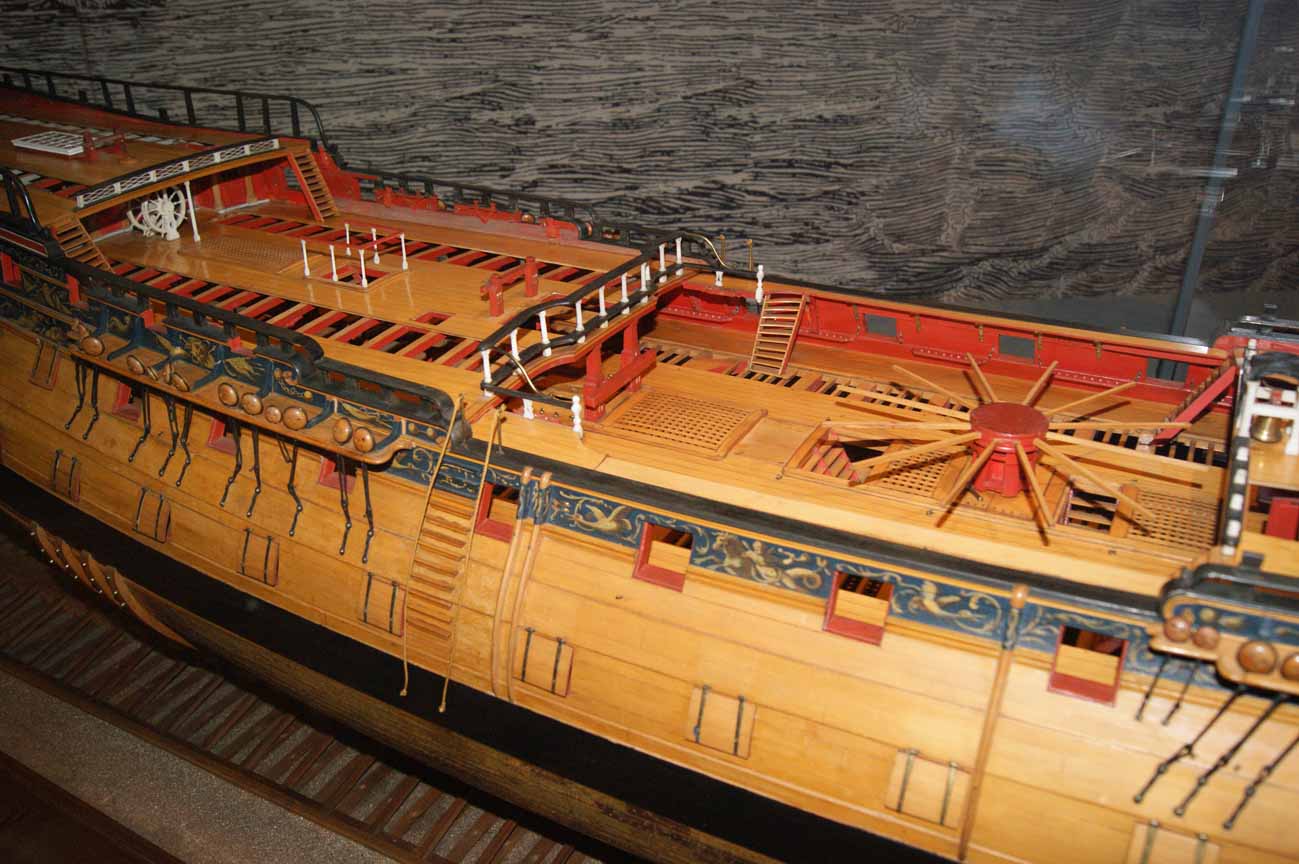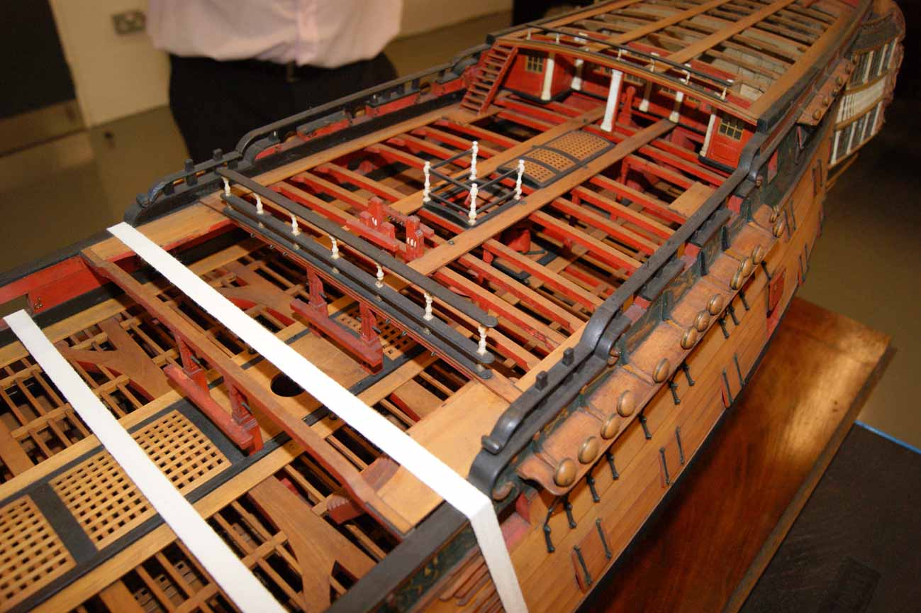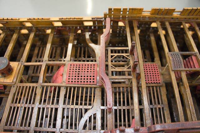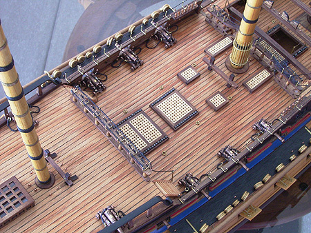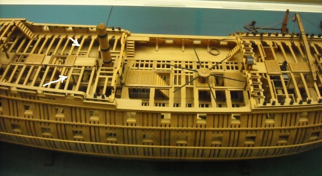 Ещё эти люки не имели комингсов и крышек - комингсы и рустерные решетки здесь у Амати - это фантазия конструкторов модели. Теоретически, эти лючки могли закрываться решётчатыми люк-пробками, однако, нигде, кроме корабля-музея Виктори, такое не встречается. Но у Виктори эти люки закрыты в целях безопасности посетителей, и такелаж там убран вовсе, что неверно.