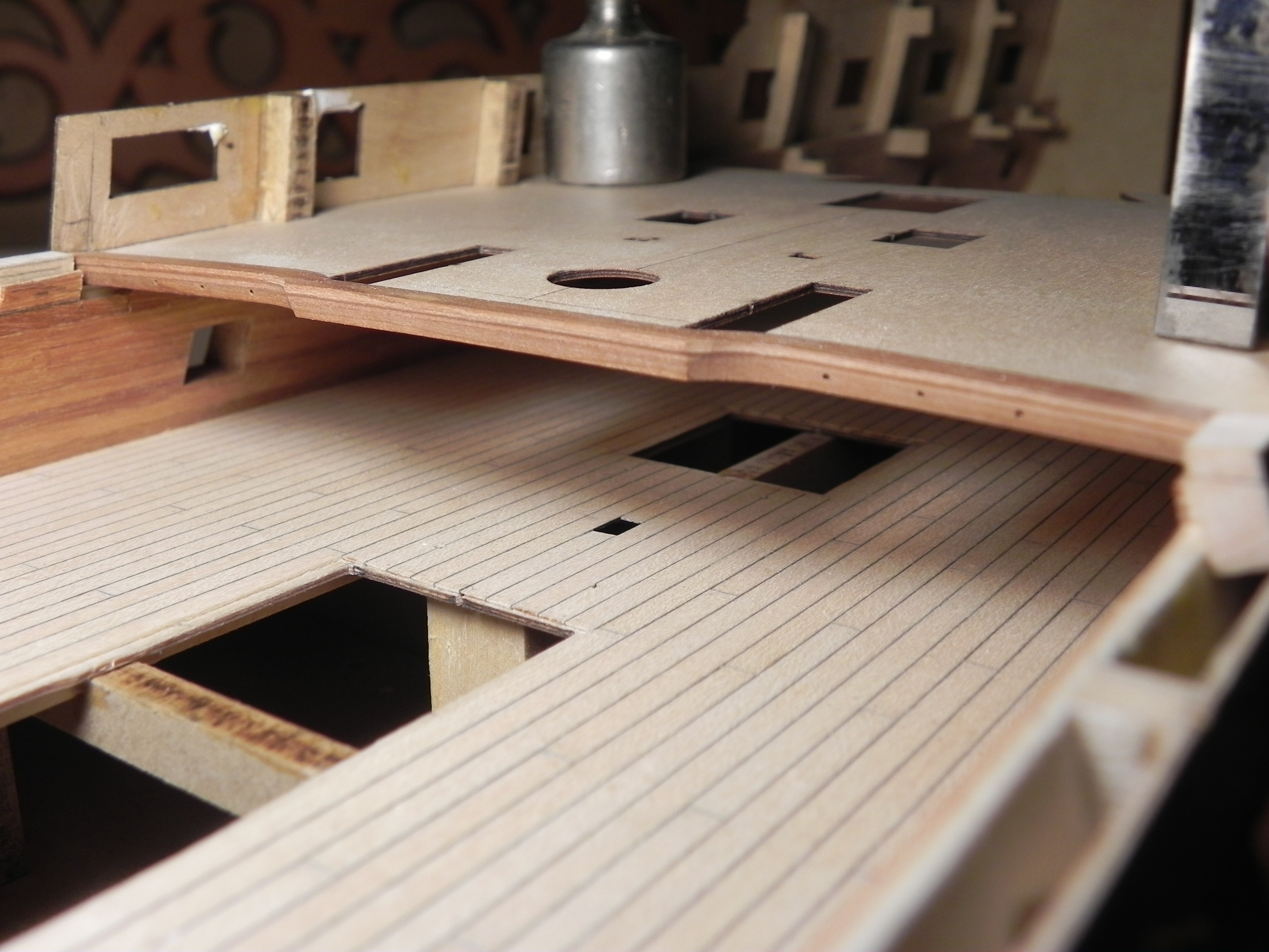 Что мы должны помнить: традиционно, первый бимс надстроек "голый", то есть не покрыт палубным настилом, как предлагают многие модельные фирмы в своих КИТах. Первый бимс толще остальных бимсов надстройки как раз на толщину палубного настила. Вместо верхней задней кромки в бимсе сделан паз (шпунт), куда и входят доски палубного настила.