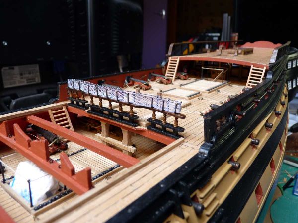 Прямо на "голой" поверхности бимса установлен высокий релинг (ограждение), называемый брест-реельс. А вот Амати предлагает установить брест-реельс на палубный настил квартердека, что, конечно, делать не надо. Помните, мы подобное уже видели, когда рассматривали форкастель? Там предлагалось поставить на палубные доски задний релинг бака, что неверно. То есть, у Амати это систематическая ошибка, и с этой ошибкой мы столкнёмся ещё и на ахтеркастеле (юте).
