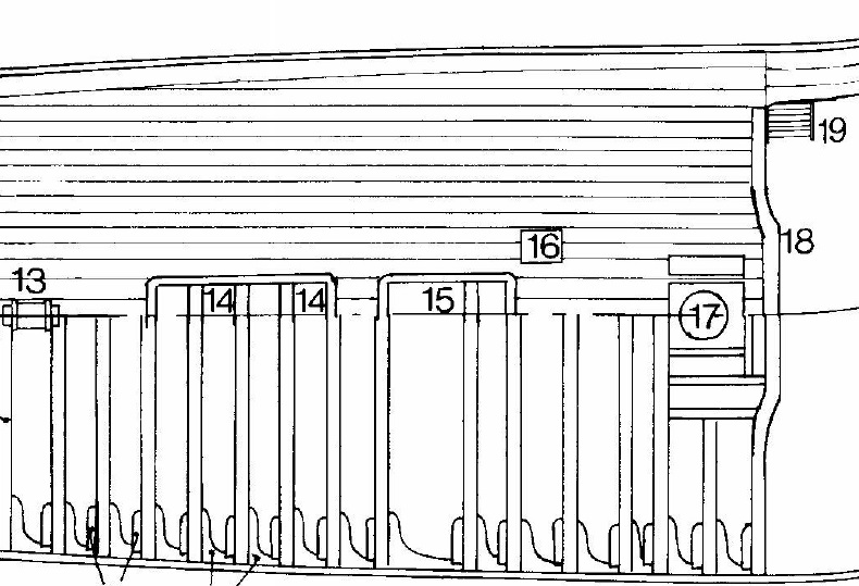 Чтобы нам не мучиться с вычислением правильного места расположения этих люков, я покажу вам скан с изображения квартердека Беллоны разработки фирмы Шипъярд, где всё уже посчитано. Ориентируйтесь по изгибу первого бимса. Так же вы можете посмотреть расположение лючков на чертеже С5 в Анатомии Беллоны Б. Лэвери.