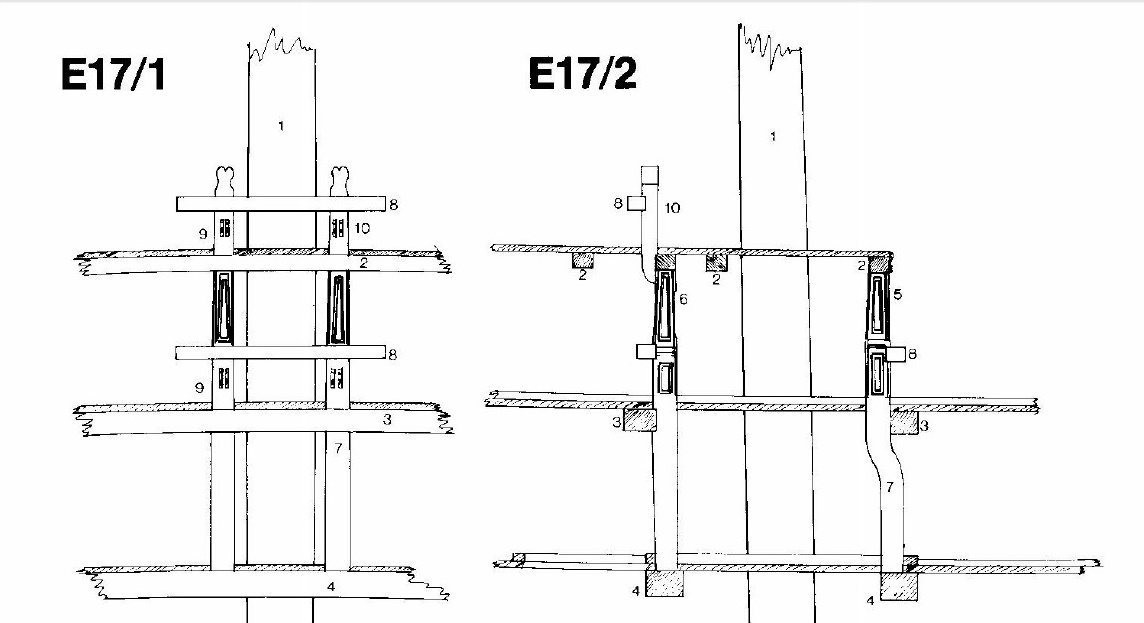 За грот-мачтой на квартердеке находится пара небольших брас-битенгов, соединённых между собой кроссписом квадратного сечения. Обратите внимание на раздвоенные, вилкообразные оголовки битенгов. Битенги показаны на чертеже Е17 Анатомии Беллоны. И, конечно, никаких кофель-нагелей на кроссписе в рассматриваемый период (до 1800 года) не было. Битенги, предложенные Амати, придётся выкинуть. Бывает, спрашивают: а где тогда фал-(гардель-)битенги грот-мачты? Они размещены на опердеке, наподобие марса-шкот-битенгов, и поддерживают второй бимс квартердека. Заводить туда фалы (гардели) и другой такелаж, через только что изученные нами лючки - та ещё задачка для моделиста!