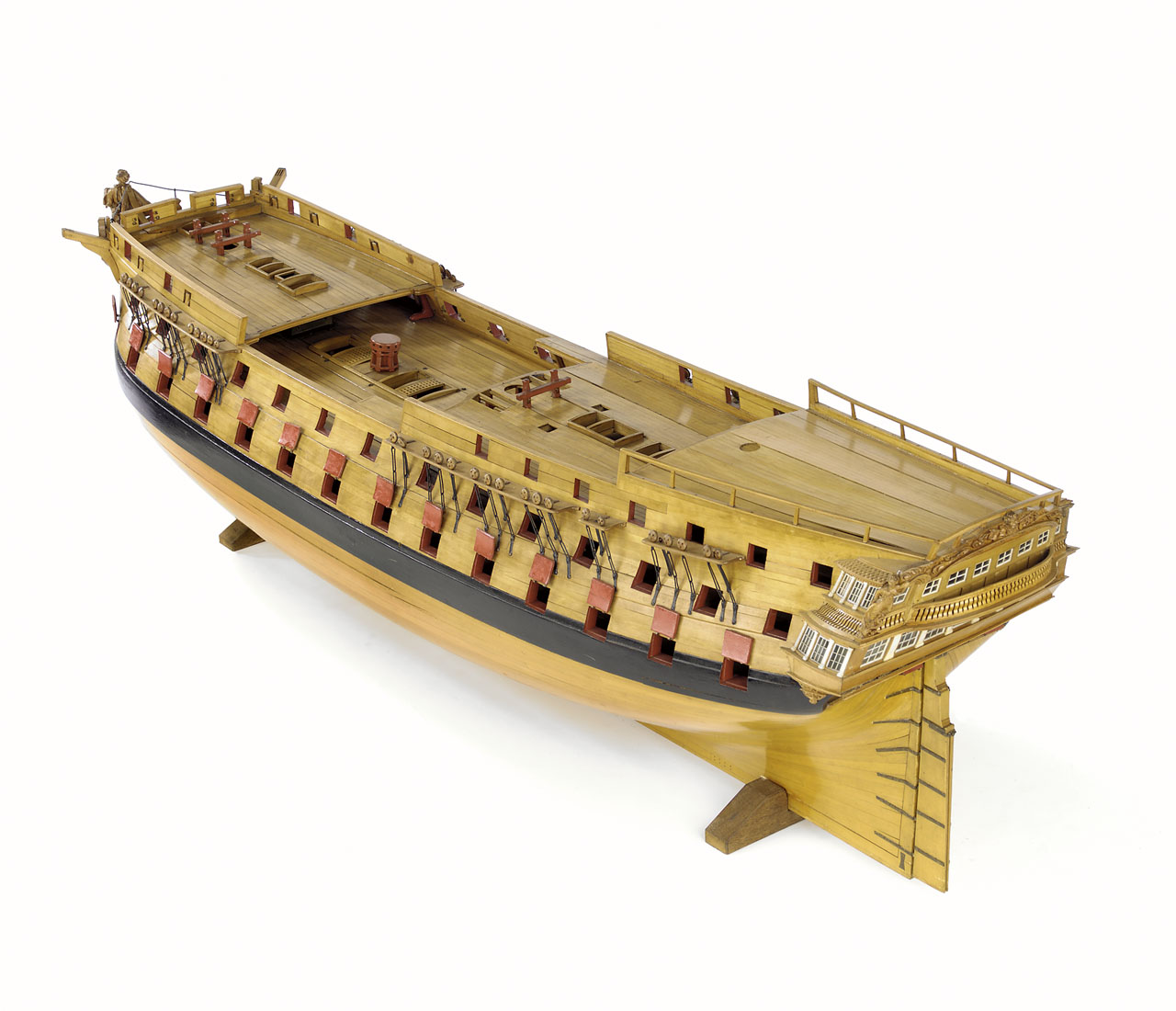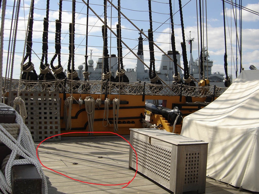 Далее в корму, за брас-битенгами, перед алмиральским трапом, на палубе квартердека сделаны два квадратных люка для стень-вынтрепа. Над ними тоже надо поработать. Они тоже не имели ни комингсов, ни рустерных крышек. Образованы бимсами и небольшими карленгсами. Лючки стень-вынтрепа и люк адмиралтеского трапа были взаимосвязаны: они имели общий бимс. Как правило, если стень-вынтреп грот-стеньги был снят, лючки стень-вынтрепа закрывались люк-пробками, сделанными из досок палубного настила, заподлицо со всей палубой, для удобства. Для извлечения люк-пробок служили рым-болты. Эти лючки отлично видны на квартердеке корабля-музея Виктори.
