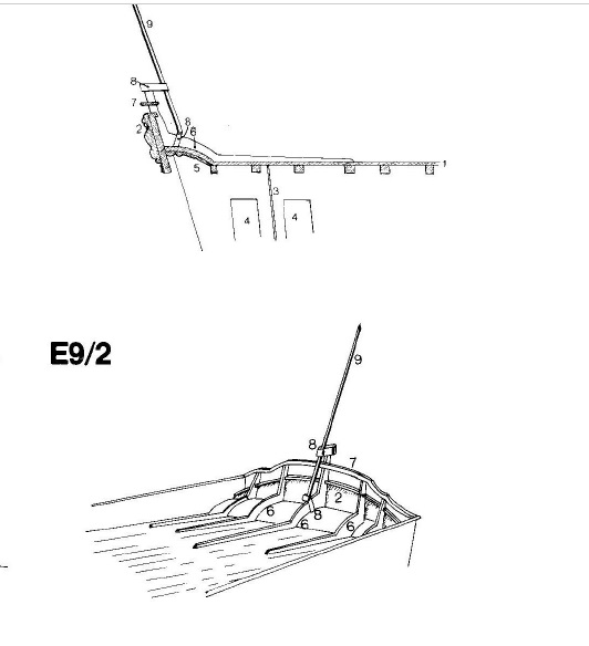 Центральная обратная кница гакаборта имеет плечо выше остальных и увенчана эзельгофтом для флагштока, а внизу кницы был поворотный шкворень для пятки флагштока. Смотрите чертёж Е9\1 и Е9\2. Конструкция элементов крепления флагштока обусловлена тем обстоятельством, что флагшток можно было отстегнуть от эзельгофта и положить вперёд на палубу, не извлекая его из шкворня.