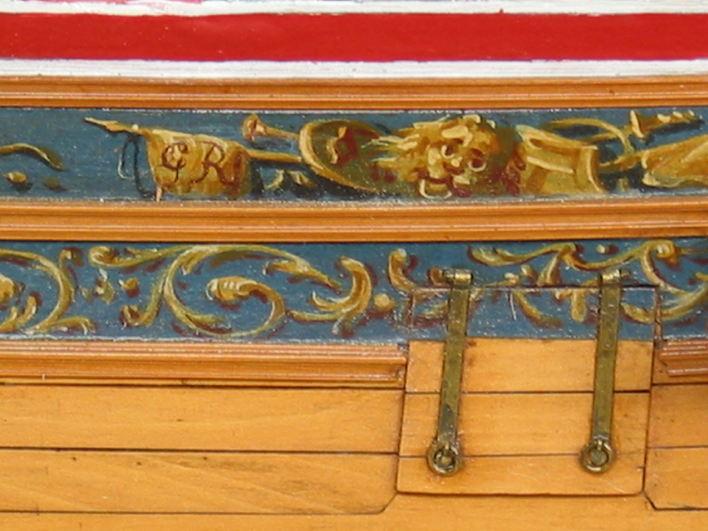 Ещё на нижнем плече центральной гакабортной кницы был рым для блока шкота бизани и утка для лопаря этого шкота. На флагштоке, внизу, была маленькая утка для флаглиней, а на вершине флагштока был клотик со шкивгатом для флаглиней. Жаль, что в наборе флагшток не предусмотрен. Несмотря на решение Амати, флагштоки на корме существовали ещё долгое время после введения гика и гафеля бизани. Для нашего же варианта, что очень приятно, гик и гафель бизани делать не надо: вместо этих реев, мы вооружим модель реем, обычно называемым бизань-рю, с парусом классической укороченной бизанью, следуя книге Марквардта.