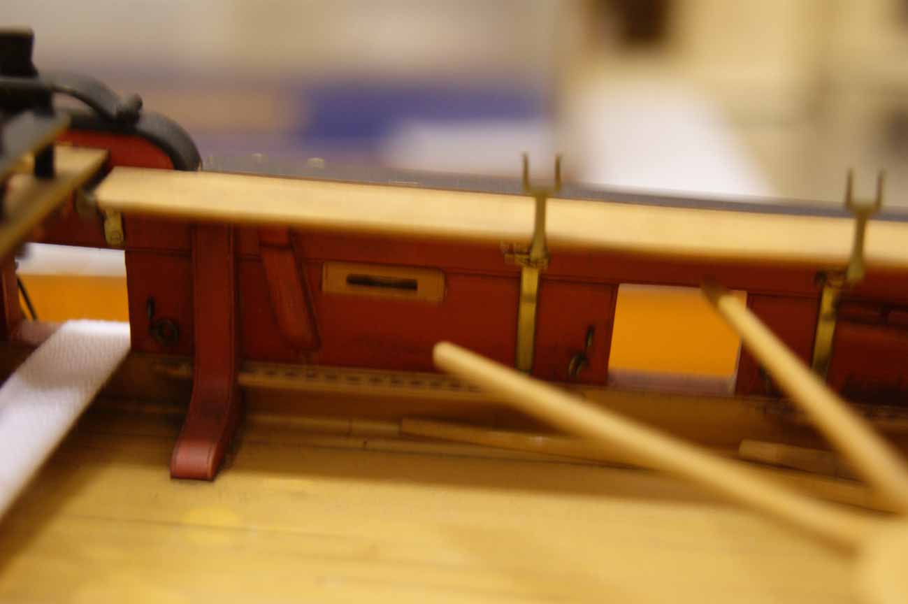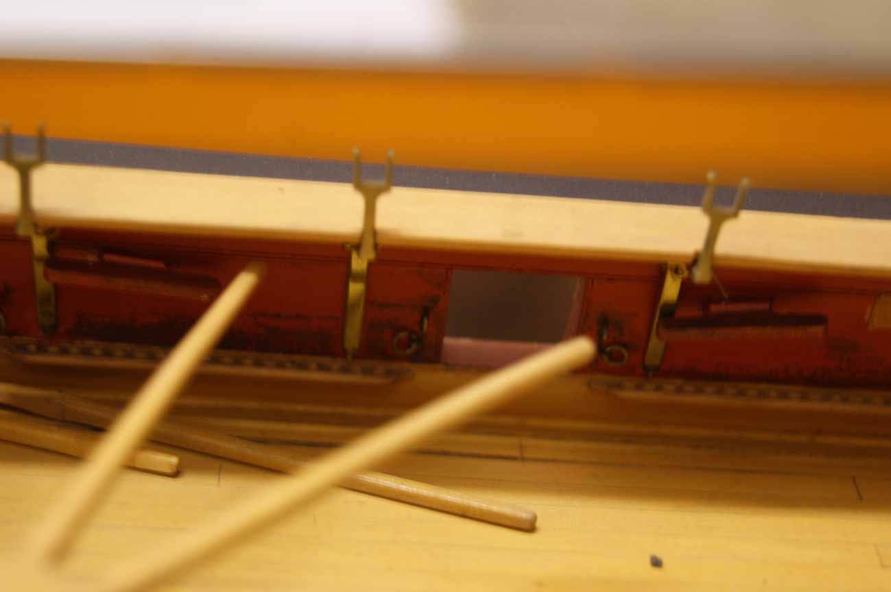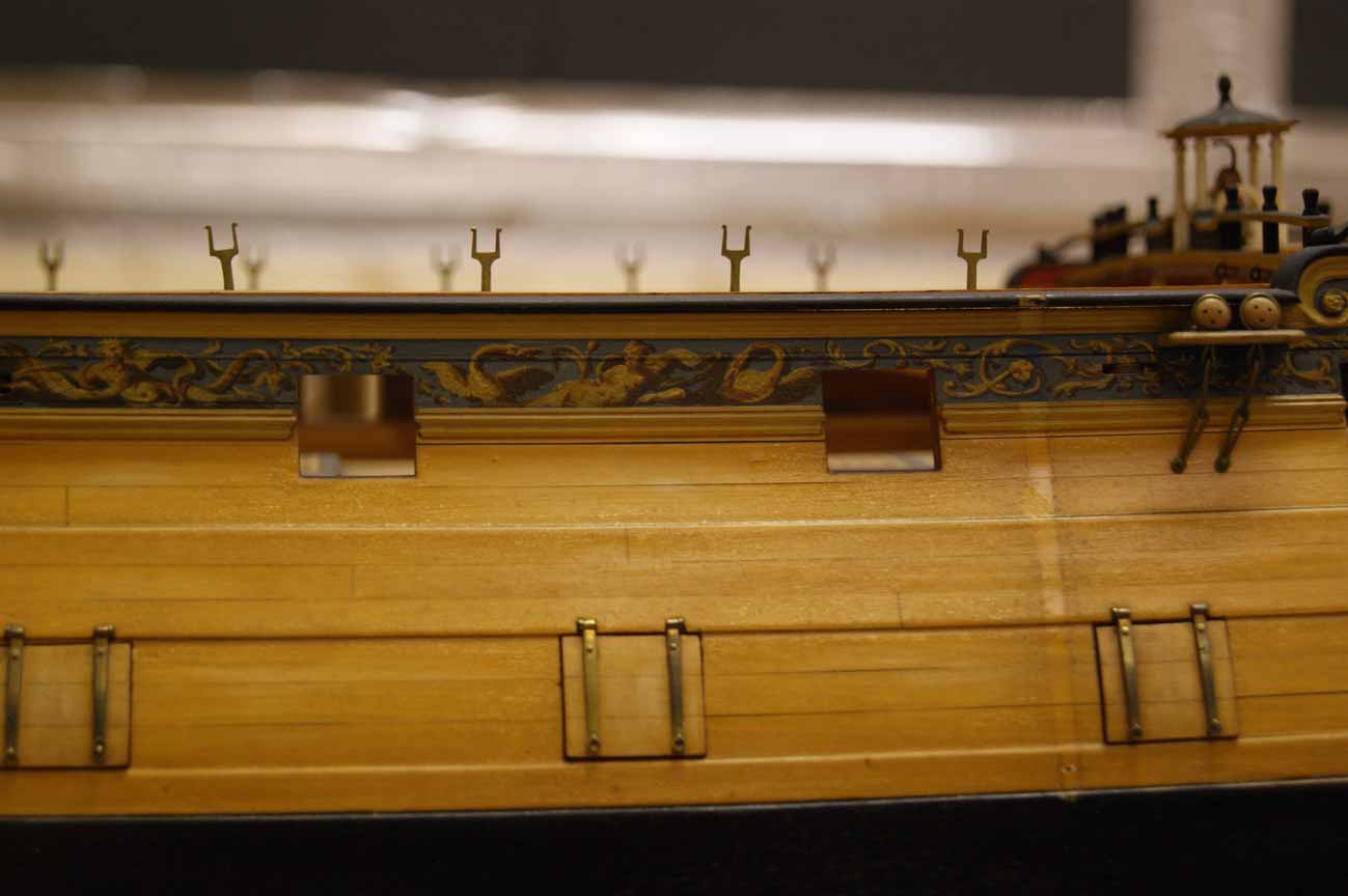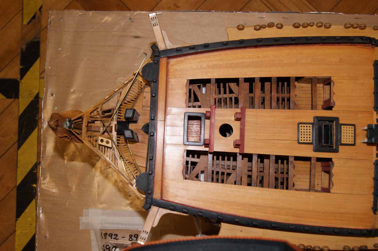 Можно видеть, что брекеты находятся прямо напротив металлических книц, удерживающих мостики. (присутствуют так же и деревянные кницы, обратите внимание) Чертёж есть в "Анатомии Беллоны". Представляют интерес шкив-гаты, утки для галсов и шкотов на внутренней части борта, а так же ложементы для ядер (по контуру комингсов люков ложементов для ядер нет).