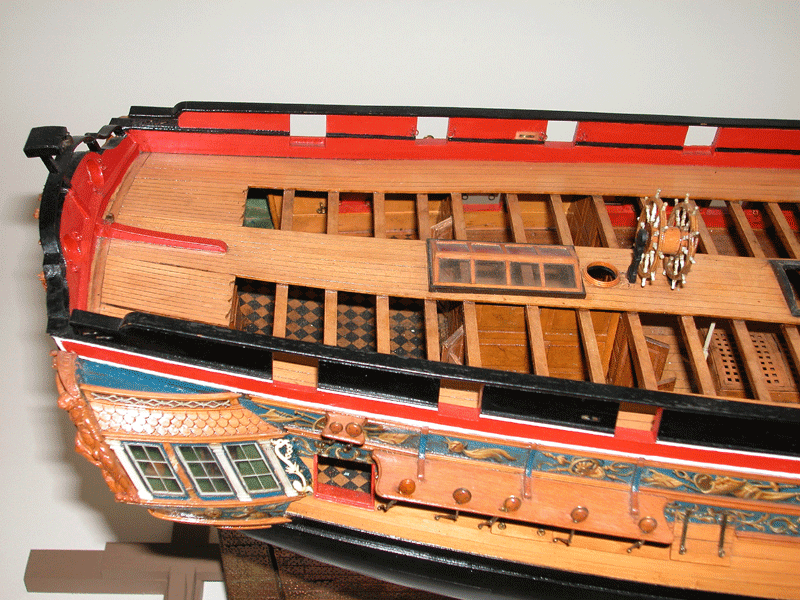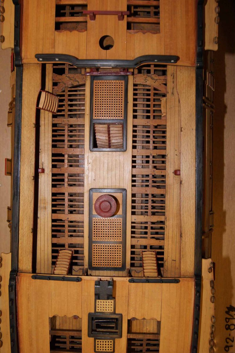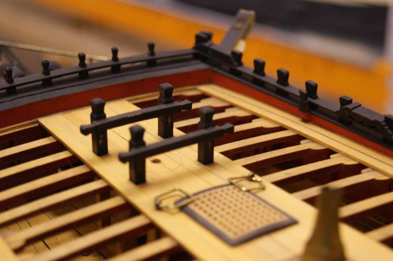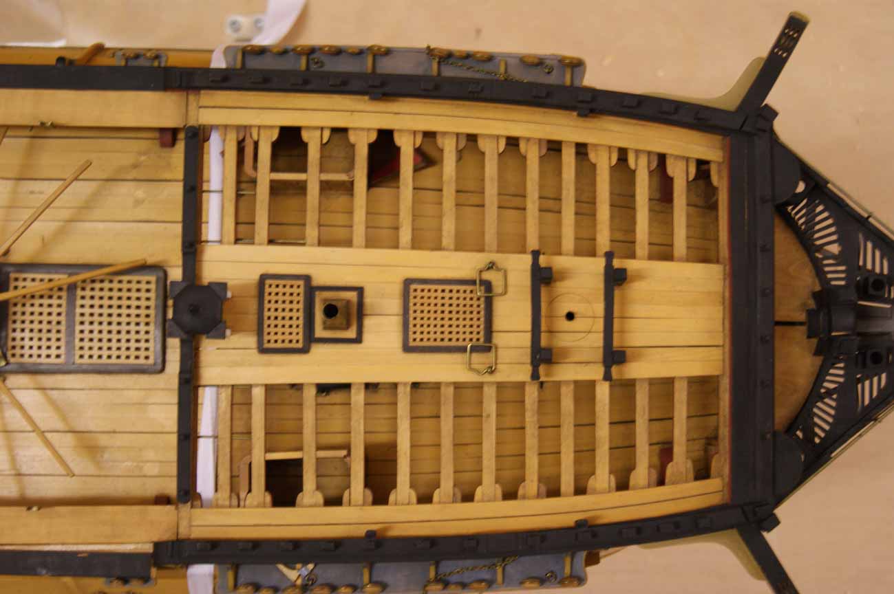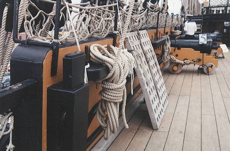 Можно видеть, что брекеты находятся прямо напротив металлических книц, удерживающих мостики. (присутствуют так же и деревянные кницы, обратите внимание) Чертёж есть в "Анатомии Беллоны". Представляют интерес шкив-гаты, утки для галсов и шкотов на внутренней части борта, а так же ложементы для ядер (по контуру комингсов люков ложементов для ядер нет).