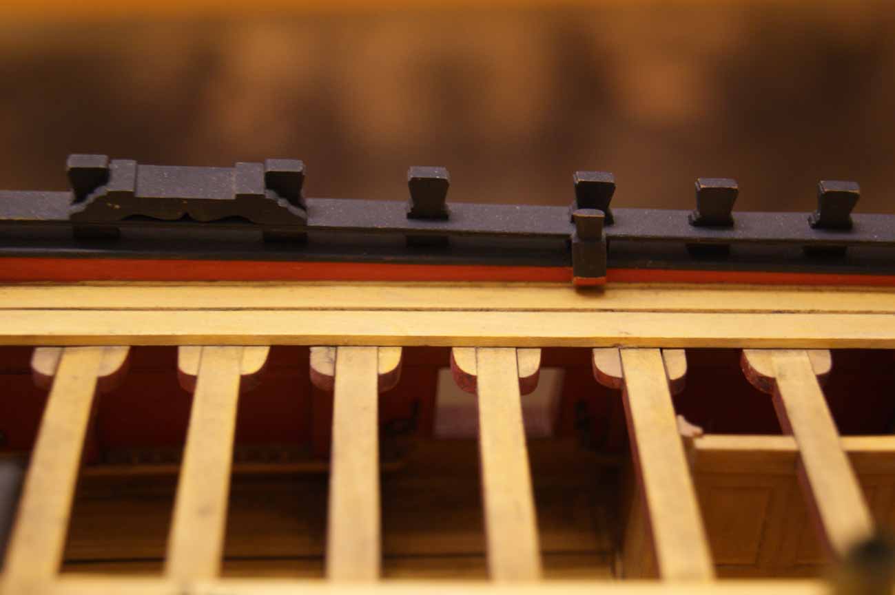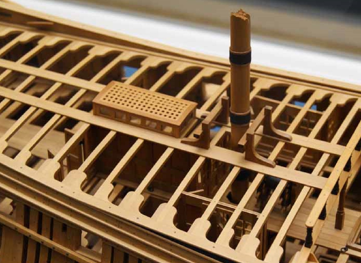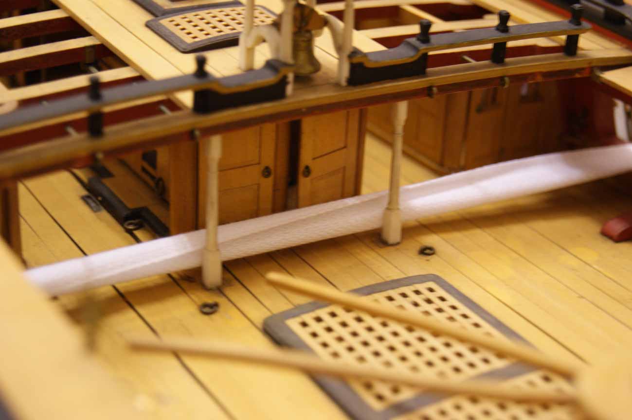 Задний релинг бака. Великолепно сделанные ложементы для запасных стеньг по обе стороны от колокольни. На опердеке видны переборки камбуза, кают боцмана и старшего плотника. А вот единой переборки, отделяющей лазарет от остальной части корабля, не показано.