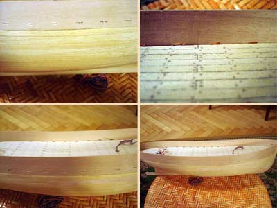 Черновую обшивку делал равномерно по обоим бортам, чтобы не перекосило корпус, а когда делал чистовую, не терпелось увидеть полностью обшитый борт, поэтому вывел сначала один