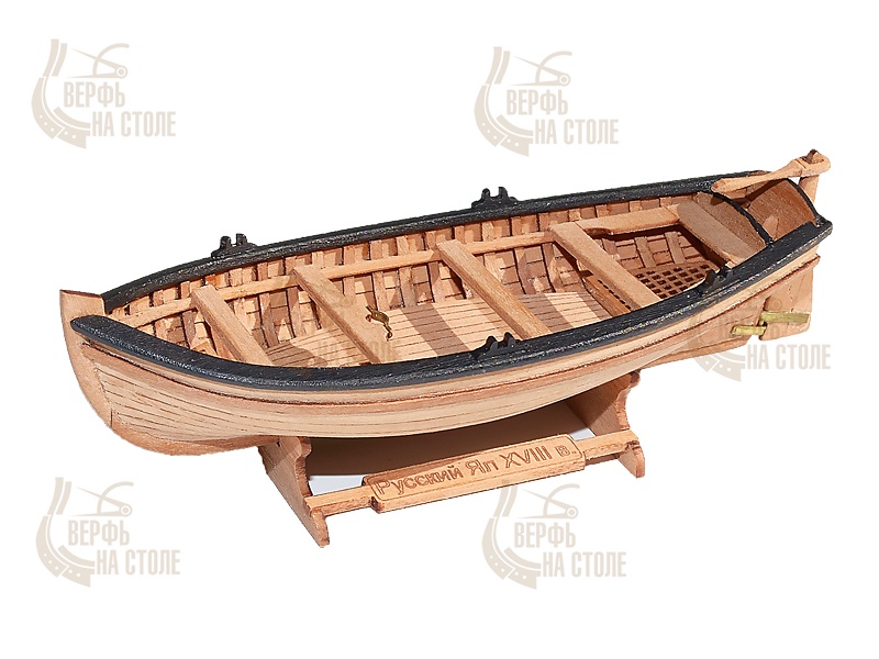 Модель такого 4 весельного яла в 72-м масштабе предлагает вам сделать новая российская фирма Фальконет. Модель яла изготавливается по хорошо себя зарекомендовавшей технологии изготовления шпангоутов и обшивки на съемном каркасе. Обшивка, шпангоуты и банки катера выполняются из груши. В наборе есть весла и заготовки для рангоута (мачта и рей) и чертеж по такелажу. А поскольку к ялу прилагается подставка, табличка с названием и фигурка моряка, то данный проект можно смело отнести к маленькой, но всё же цельной модели.