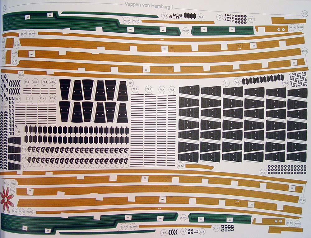 - Бумажные детали для всех элементов модели. На 11 листах формата А3 вы найдёте пояса обшивки корпуса, штевни, бархоуты, пушечные станки, палубы с имитацией деревянного настила, планшир, якоря, пушки (да, и они тоже делаются и бумаги!).