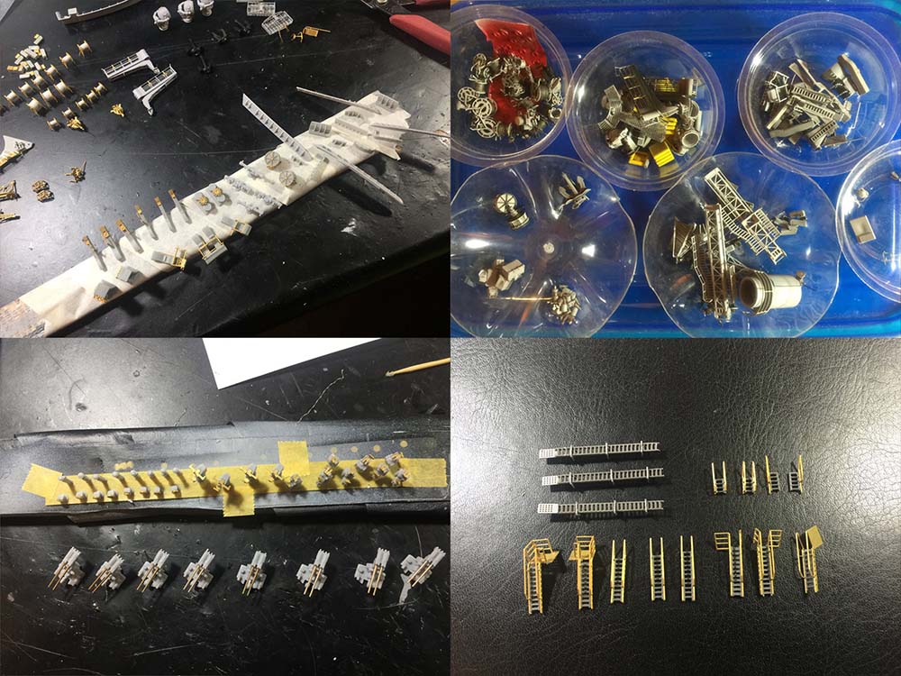 Особенно нам понравились ажурные конструкции ангаров, на крыше которых стоят киль-блоки под шлюпки, установлено множество трапов, мостиков, балок и переходов. И даже сдвижная дверь ангара состоит из пяти деталей! Жаль, что ангары будут почти не видны за шлюпками и катерами. Но вы же знаете, что ангары сделаны «на совесть». В наборе присутствуют два гидросамолета Arado, их можно сделать как со сложенными, так и с разложенными крыльями. Вот только эти гидропланы на модели Бисмарка не летают. Шлюпки и моторные катера четырех типов (9 штук) вам надо будет сделать из пластика и фототравления, загрунтовав и окрасив каждый из них. Башни главного калибра и вспомогательные орудия могут поворачиваться на своих осях (стволы неподвижны), леерные ограждения на верхних уровнях надстроек даны фототравлением, а по палубе само ограждение надо сделать тонкой нитью, продев ее через множество трехрядных стоек. Эта работа сравни с вязкой выбленок на вантах парусника. Завершает модель подставка и солидный деревянный блок с латунной табличкой с названием линкора.