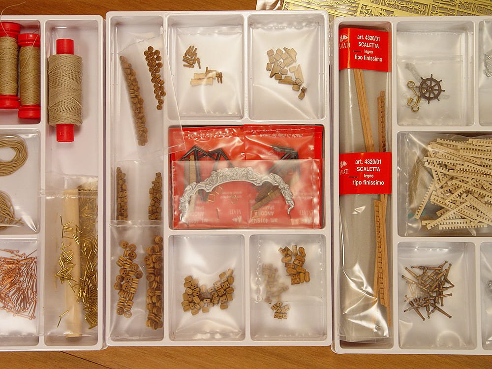 Традиционная двойная обшивка из гибкой липы и приятного темного ореха, настил палубы из танганики шириной 3 мм. Киль, штевни и перо руля выполнены лазерной резкой из цельного ореха, что не дает фанерных торцов. Также из цельного ореха даны и другие каркасные детали, торцы которых будут впоследствии видны на модели парусника. Палуба довольно плотно застроена: колокольня, труба камбуза, решетки, кран-балки на баке; пушки, трапы, решетки, специальные помпы на главной палубе; трапы, шпиль, решетки, люки, штурвал на юте. Красиво сделаны планширь и ограждения, фототравленные вант-путенсы с фиксатором, деревянные бейфуты для рей. Кормовое украшение, боковые галереи и носовая фигура даны неплохими отливками из белого металла, а декор, идущий по всему борту, дан большим листом фототравления отличного качества. Вооружение корабля состоит из 16-ти пушек на станках и 16-ти вертлюжных пушек.
