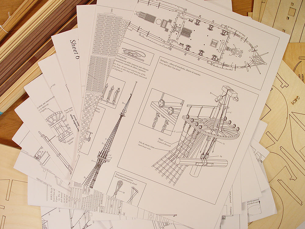 Рангут и такелаж модели корабля оставляют самое приятное впечатление: аккуратные блоки и юферсы из ореха, нити нескольких диаметров и, самое главное, сразу же двух цветов - светлые и черные, точеные нагеля из дерева, рымы, штаг-блоки. Хорошая инструкция в стиле Amati, 12 больших полноразмерных листов чертежей должны сильно помочь в сборке этой прекрасной во всех отношениях модели. В качестве необъяснимого недостатка можно отметить отсутствие в наборе каких-либо флагов и парусов во всех моделях кораблей Victory Models.