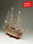 Корпус с двойной обшивкой из липы и отличного ореха, палуба покрывается рейками из танганики. Случайно или нет, но рейки ореха для чистовой обшивки даны как светлые, так и темные. Это позволяет создать светлые полосы, которые были на прототипе окрашены желтой охрой, не прибегая к окраске. Для помощи в сборке все деревянные части уже вырезаны. Как и положено, бархоуты выполнены более толстым рейками. Перо руля, что очень редко бывает в моделях, составное, из пяти отдельных вертикальных элементов. Это поистине удивительно!Пушки на верхней палубе установлены на станки из ореха и имеют брюк и тали. Фонари, леера, ограждения и другие детали из латуни, литые или из ореха. Около сотни прекрасных металлических пушек и карронад «под бронзу» отполированы для придания им натурального внешнего вида. Пушечные порты открываются и закрываются на своих петлях. Набором предусмотрены калвы на салингах, все марсовые площадки обшиваются.