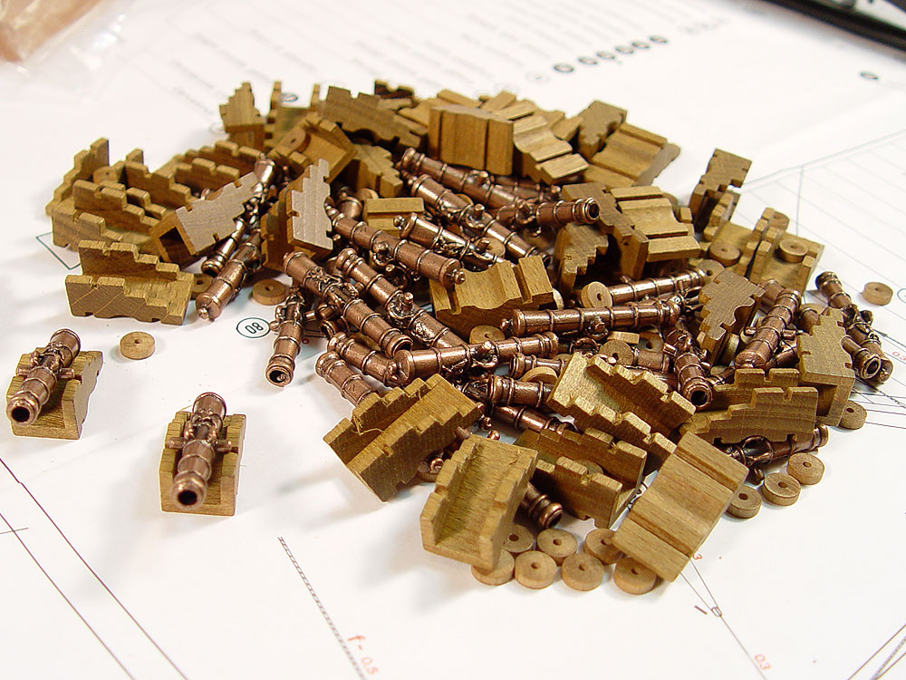 Эта модель корабля из дерева итальянской фирмы COREL прекрасна, великолепна и, несомненно, является бриллиантом во всей коллекции. Это обусловленно несколькими причинами: большой масштаб, позволяющий проработать множество деталей; размер законченной модели; роскошный подбор материалов. Но самым обворожительным в модели является литьё. Более 80 литых фигурок, составляющих украшение фрегата, имеют размеры от 2-х до почти 6-ти см. При этом литые детали затонированы под старину и не нуждаются ни в какой обработке. Из других достоинств модели можно выделить 58 литых пушек под бронзу, сделанных со всеми полагающимися элементами на орудийном стволе. Обшивка выполняется из первоклассного ореха, все деревянные детали каркаса уже вырезаны, причем бимсы верхних палуб даны отдельными деталями, поэтому проработка нижних палуб выполнена на должном уровне. В комплекте большой лист фототравленных деталей, множество фитингов, два огромных якоря и еще более впечатляющая шлюпка. Чертежи и инструкции, ткань для парусов, четыре флага (кормовой особенно хорош) и деревянная подставка входят в набор.