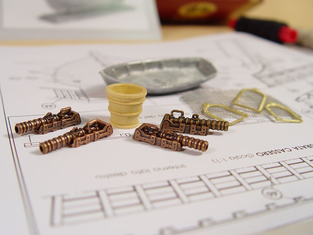 Конструкция корпуса наборная, киль и шпангоуты уже вырезаны лазером. Обшивка корпуса двойная: липа и орех. Палубы обшиваются планками светлой танганики. Детализация палубы и всей модели отличная. Здесь и изящные витиеватые двери, и ажурная сеточка, и точно выполненный брашпиль. В комплекте есть металлические пушки с лафетами, помпа, брюканцы, правильные треугольные юферсы, шлюпка, одно- и трехшкивные блоки. Каждый якорь сделан из семи отдельных деталей. Руль поворотный, а такелаж уже содержит нити как черного, так и бежевого цвета и различного диаметра. На ткани уже размечены контуры будущих парусов.