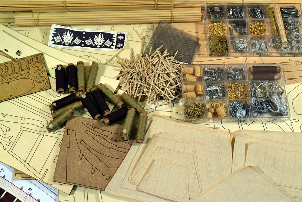 - более 500 различных деталей для сборки мелочевки и декора этой модели, включая литую табличку с названием, основание и готовые паруса (требуют окраски в черный цвет);