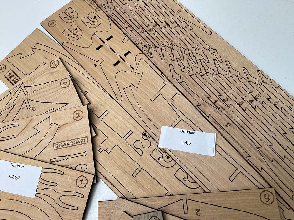 И действительно, производитель постарался на славу: мы насчитали 35 деревянных листов с вырезанными лазером деталями, причем фанеры нет совсем, только МДФ для стапеля и цельное дерево для самой модели. Внушает уважение и вырезанный декор судна – такого мы не видели нигде. Силовой каркас из ольхи 4 мм, палубы из ольхи 2 мм, щиты и весла - орех 2 мм, борта - бук 1,2 мм. Мачта и рей уже вырезаны из ольхи, их надо только скруглить. Блоки - ольха, тоже все уже готовы. Резьба из бука и ольхи, вся деревянная. На щитах выгравированны узоры, которые взяты из проверенных скандинавских источников.