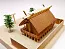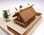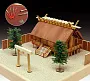Модель собирается из уже вырезанных каркасных деталей, устанавливается на сваи, делается стропильная система для кровли. А вот сама двухскатная крыша собирается отдельно, а затем уставится сверху на дом. Входные ворота, забор, основание – всё это надо будет вам сделать из деревянных заготовок. А вот пара зеленых кипарисов даны уже готовыми – только расправьте у них ветви и установите на макет. Понятная сборочная инструкция в пошаговых фотографиях, пояснения на японском языке.