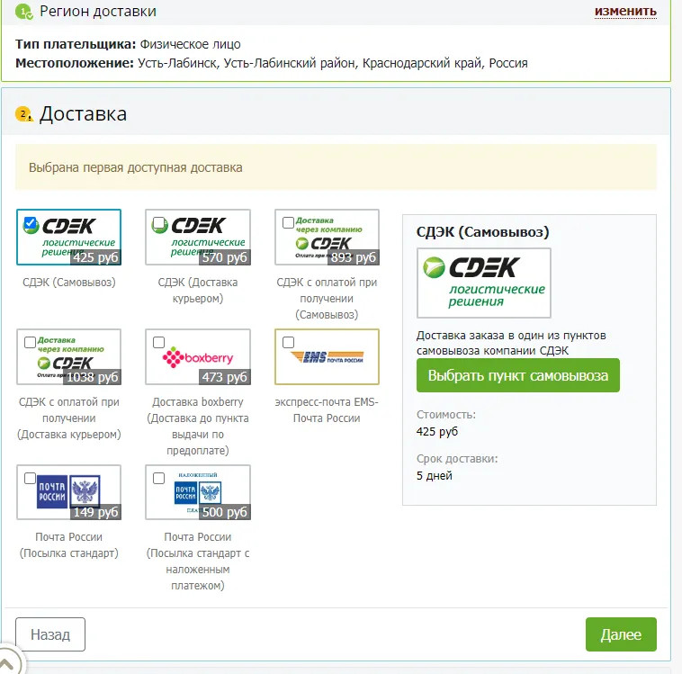 На этом экране видны все доступные способы доставки и их стоимость. Нажмите на тот, который подходит вам больше всего.