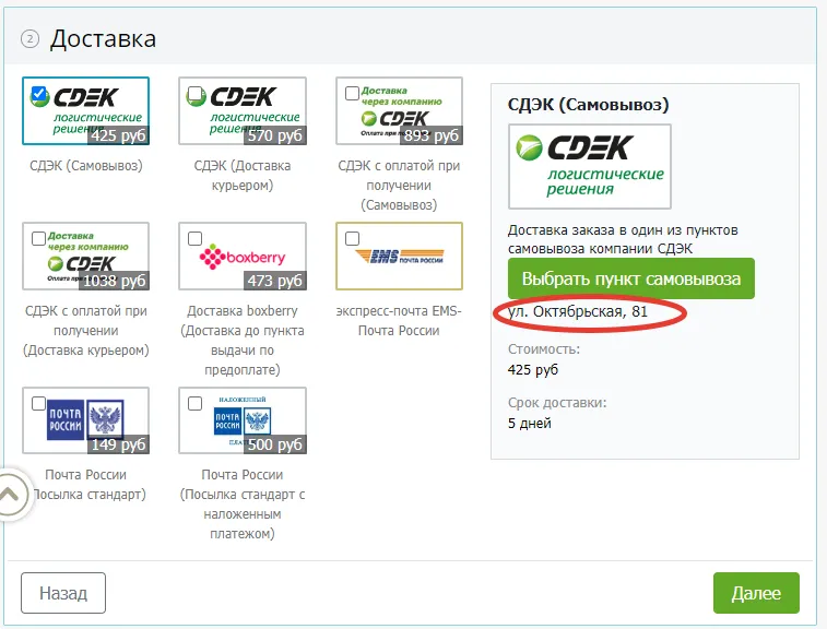 Если вы выбрали доставку до пункта выдачи, необходимо отдельно выбрать его, нажав на указанную кнопку.