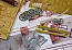 - Модельный нож, лезвия для ножа, надфиль, пинцет, три пластиковых зажима, миниатюрный шкурник, набор кисточек и наждачная бумага;