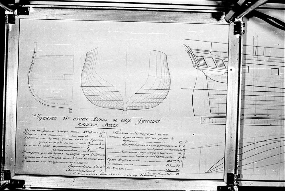 Практический чертеж 24-х пушечной яхты в виде фрегата именуемой "Россия". постр. 1814 год. |  Практический чертеж 24-х пушечной яхты в виде фрегата именуемой "Россия". постр. 1814 год. |  Внутреннее расположение 24-х пушечной яхты в виде фрегата именуемой "Россия". построен 1814 год. |
