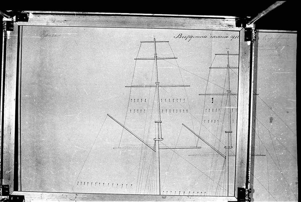 Чертеж 24-х пушечной яхты в виде фрегата именуемой "Россия". |  Чертеж 24-х пушечной яхты в виде фрегата именуемой "Россия". |  Чертеж шлюпа "Открытия". 1819 год. |