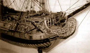 Bon Homme Richard Вид на корму показывает галереи, эмблему с названием корабля, резьбу и два пушечных порта. Обратит внимание, что перо руля имеет прорезь на своей задней кромке. |