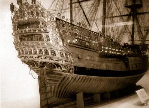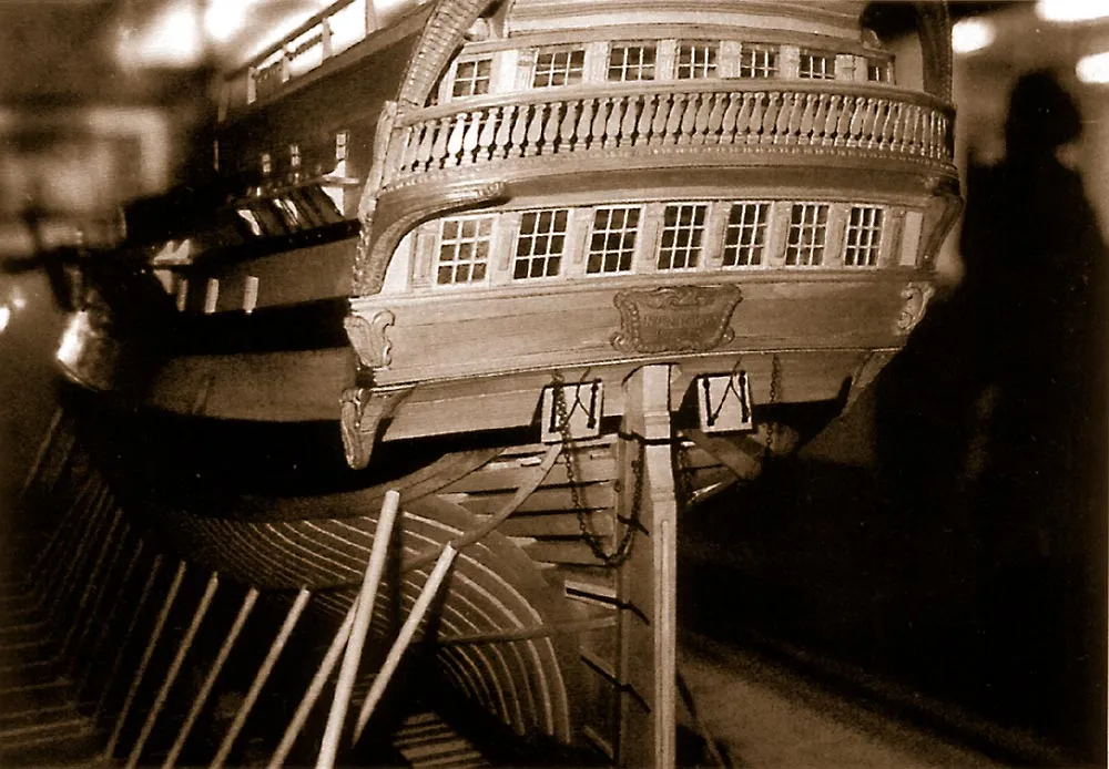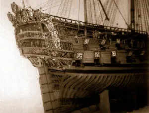 Предыдущая модель, вид на корму показывает богатую резьбу транца и пилястров. Обратите внимание на необычные, в виде изогнутой капли, нижние окончания квартергалереи. |