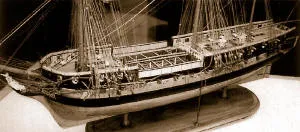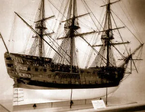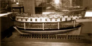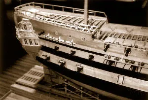 Chesapeake Эта модель была специально заказана для подарка капитану Филиппу Бруку (Phillip Broke) после захвата Chesapeake. Полковник Роджерс выкупил эту модель у одного из потомков Брука, лорда Willoughby de Broke. На этой фотографии показана корма корабля, галерея, украшения в виде скрещенных флагов и двух купидонов с обеих сторон, спущенный веревочный трап, цепные штур-тросы руля, прорез на пере руля и два пушечных порта в корме. |
