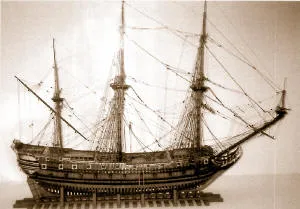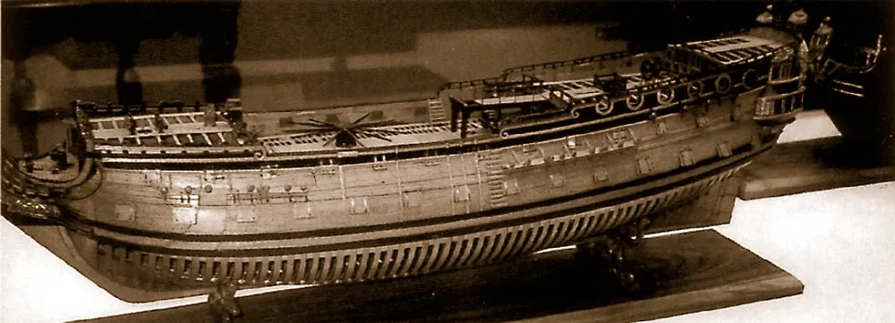 Неизвестный 64-х пушечный английский корабль, примерно 1736 год. Масштаб 1:48, длина 1370 мм, длина 1170 мм, ширина 530 мм. |