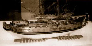Bon Homme Richard Американский 70-ти пушечный корабль, 1779 год. Хотя эта модель является исключением в коллекции Роджерса (она выполнена в наше время), но она стоит рядом со всеми другими моделями и обычный посетитель не способен отличить ее от других. Bon Homme Richard, переоборудованный из французского торгового судна le Duc De Duras и переданный американцам, является хорошим дополнением к моделям коллекции, намного старшим его. Эта великолепная модель была построена канадским моделистом Бобом Куком (Bob Cook). Данная фотография показывает квартергалерею правого борта и три длинных пушки на нижней палубе. Модель представлена на стапеле с кирпичным основанием, подпорками и рельсами. |